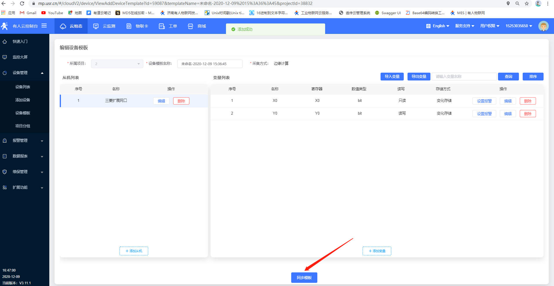 5.點(diǎn)擊同步模板,云端設(shè)備添加完成,等待上線