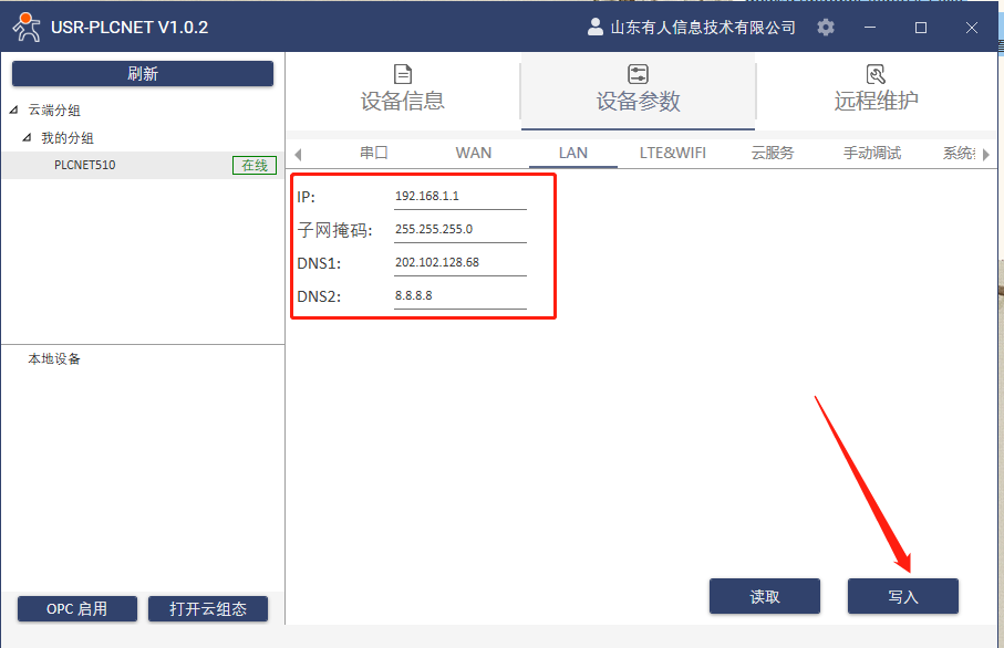 7.設(shè)備參數(shù)LAN口IP和PLC的IP在同一個(gè)網(wǎng)段