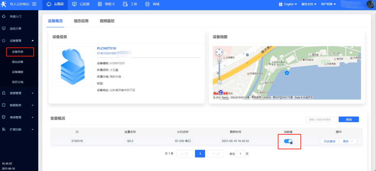 l 重啟完成后,觀察平臺數(shù)據(jù),采集成功(數(shù)據(jù)采集時請不要打開遠程維護的透傳功能)