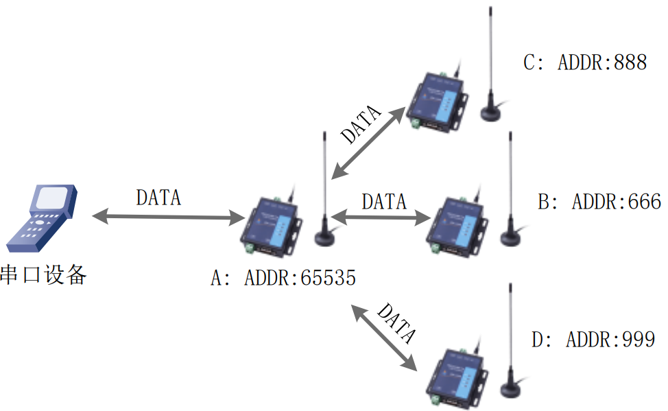 所有設(shè)備工作在透?jìng)鳡顟B(tài),保證廣播發(fā)送的模塊的ADDR為65535,其他設(shè)備與廣播設(shè)備的速率等級(jí)、信道參數(shù)相同。