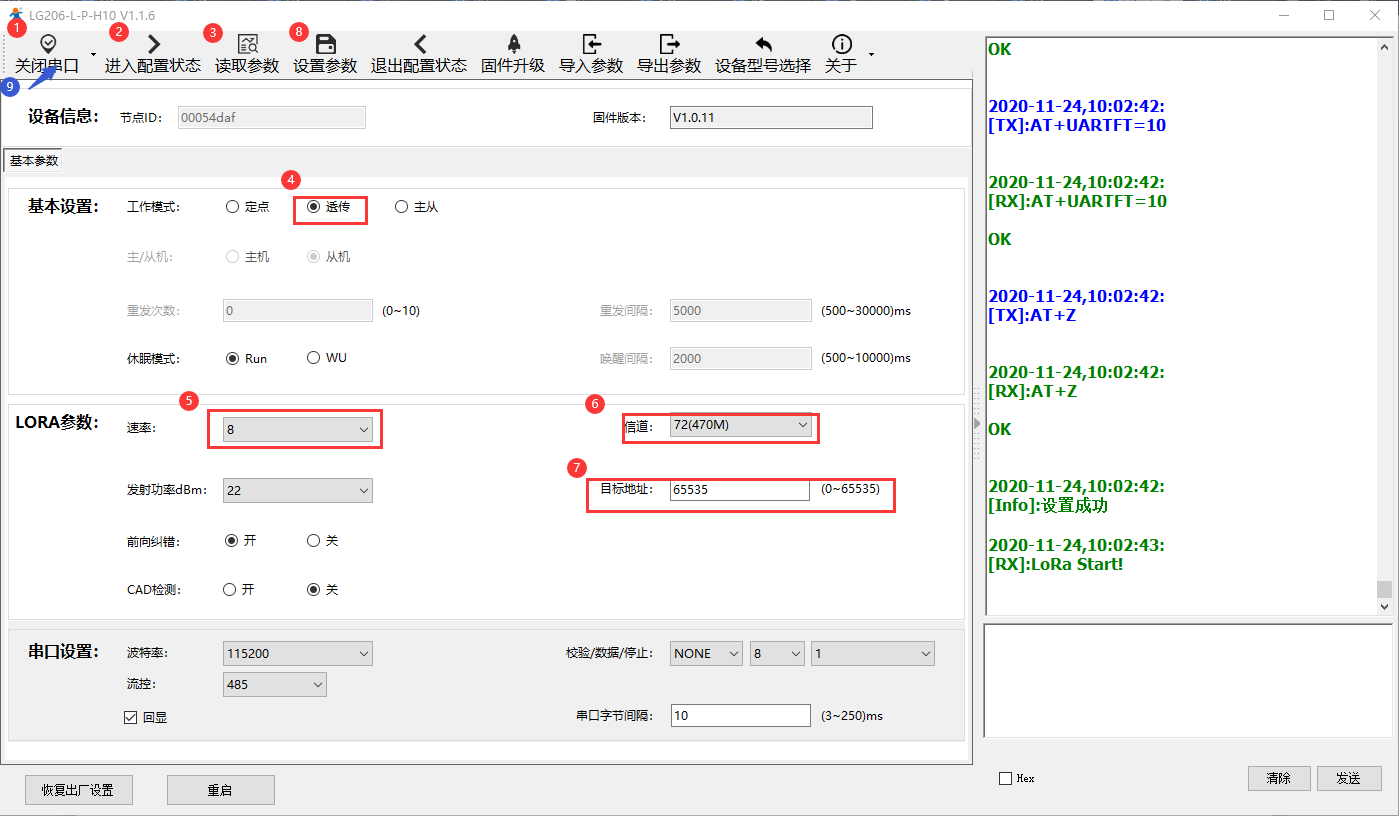打開(kāi)LoRa設(shè)置軟件→ 選擇LG206-L-P-H10 → 依次點(diǎn)擊打開(kāi)串口(選擇A、B對(duì)應(yīng)的串口號(hào),串口參數(shù):115200,None,8,1,NFC) → 進(jìn)入配置狀態(tài) → 讀取參數(shù) → 配置圖中的參數(shù) → 一鍵設(shè)置所有參數(shù) → 關(guān)閉LoRa設(shè)置軟件。