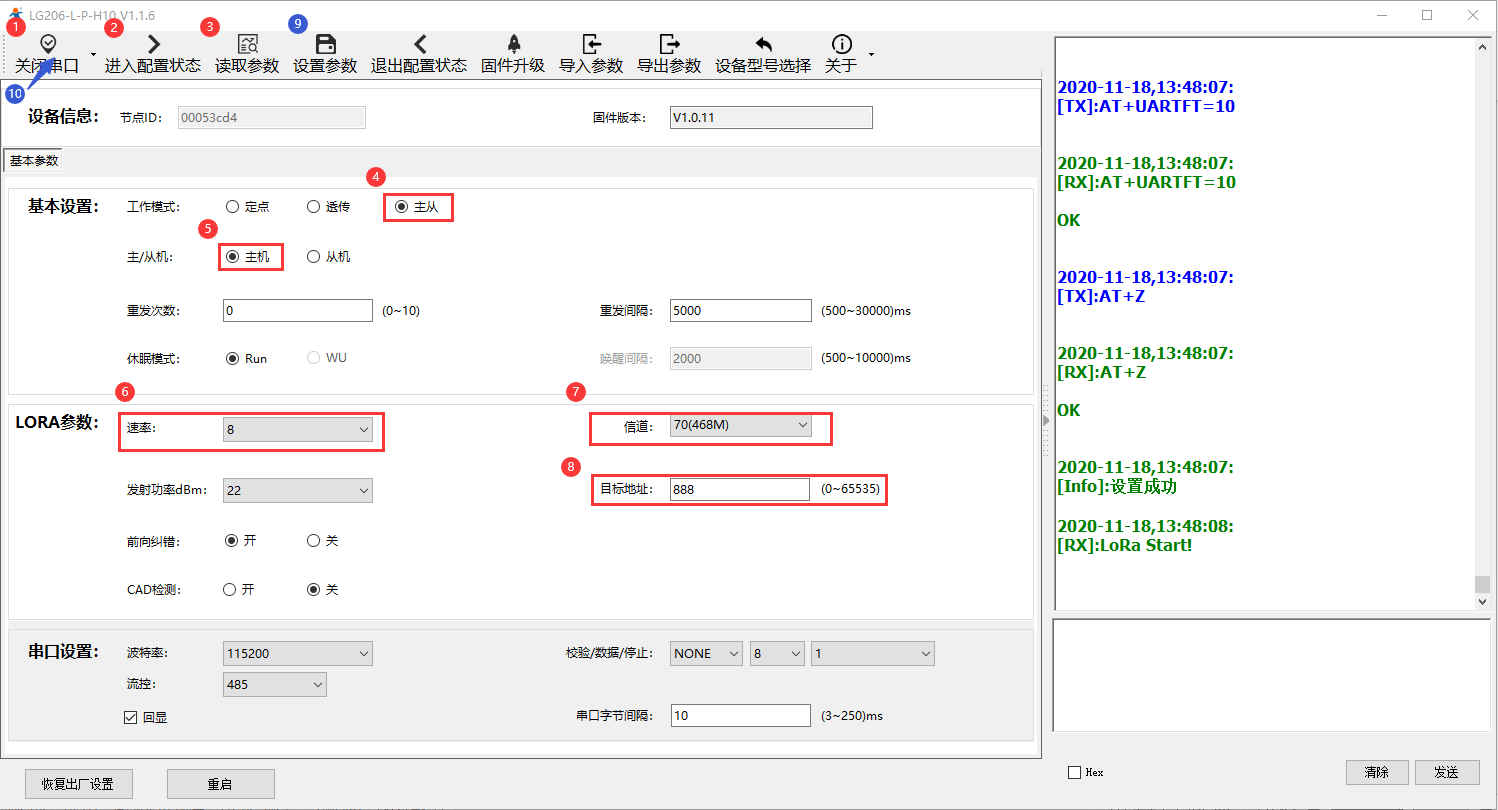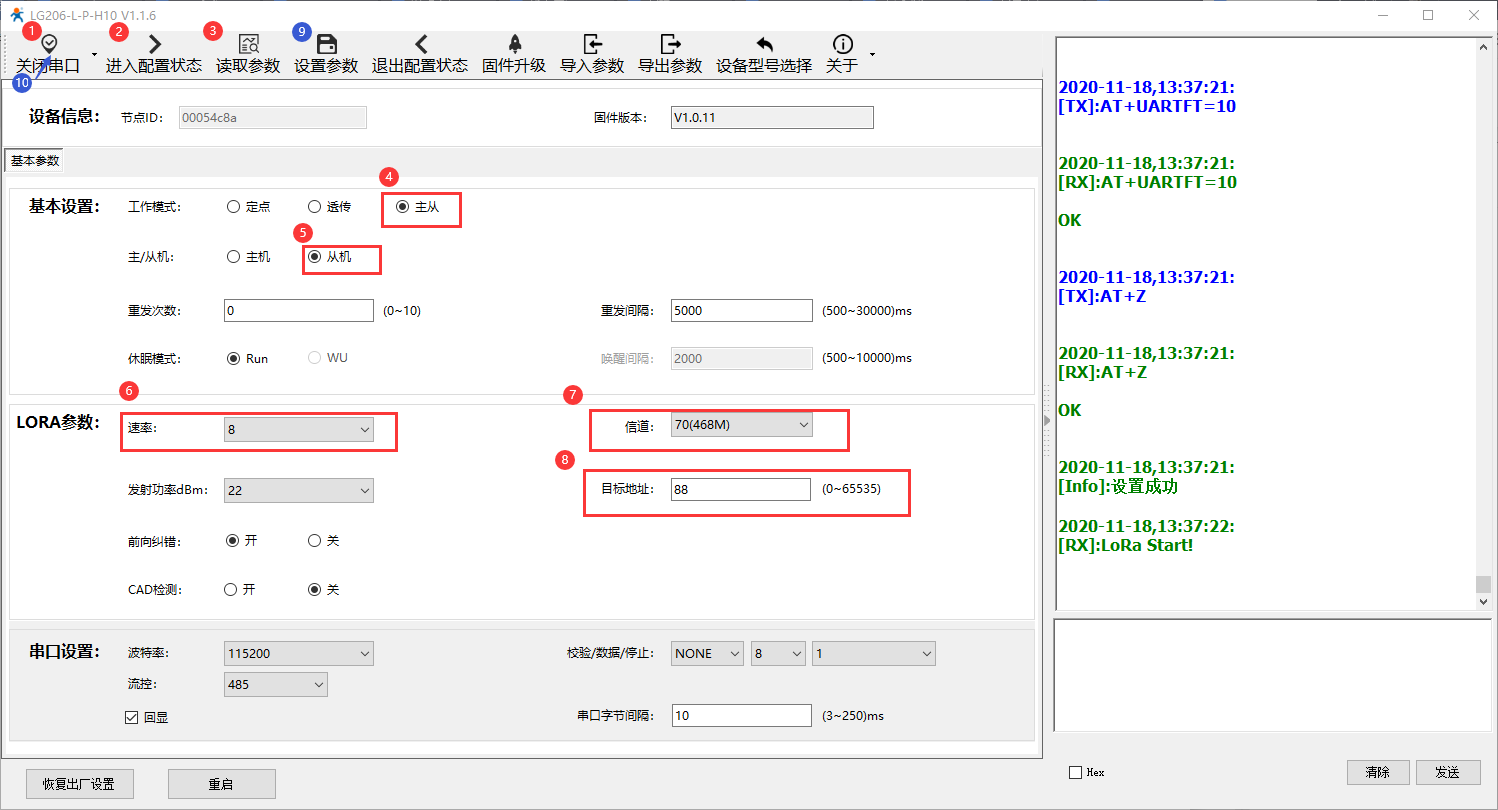 打開LoRa設(shè)置軟件,選擇LG206-L-P-H10,依次點擊打開串口(選擇A、B對應(yīng)的串口號,串口參數(shù):115200,None,8,1,NFC)、進(jìn)入配置狀態(tài)、讀取參數(shù)、配置上表中的參數(shù)、一鍵設(shè)置所有參數(shù),關(guān)閉LoRa設(shè)置軟件。