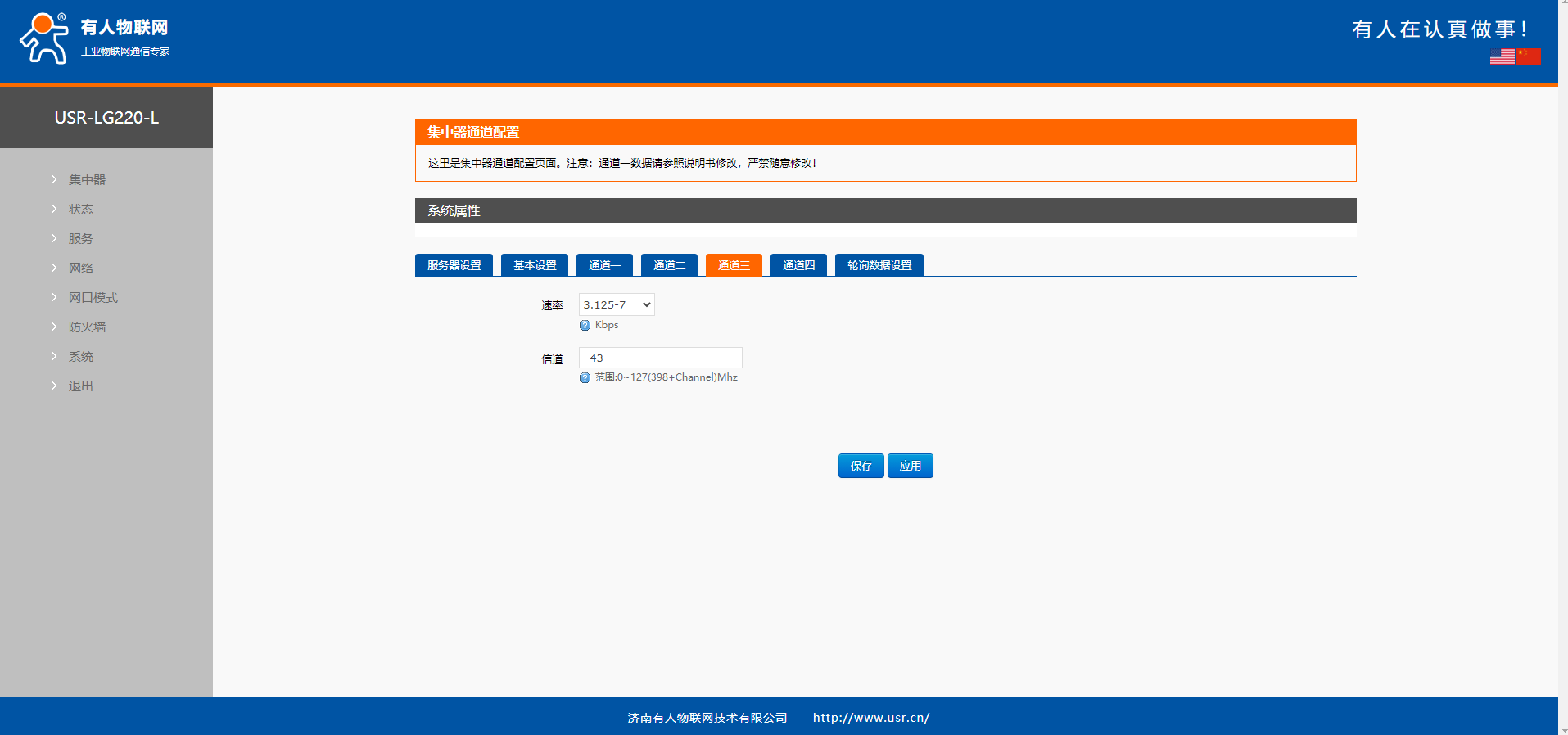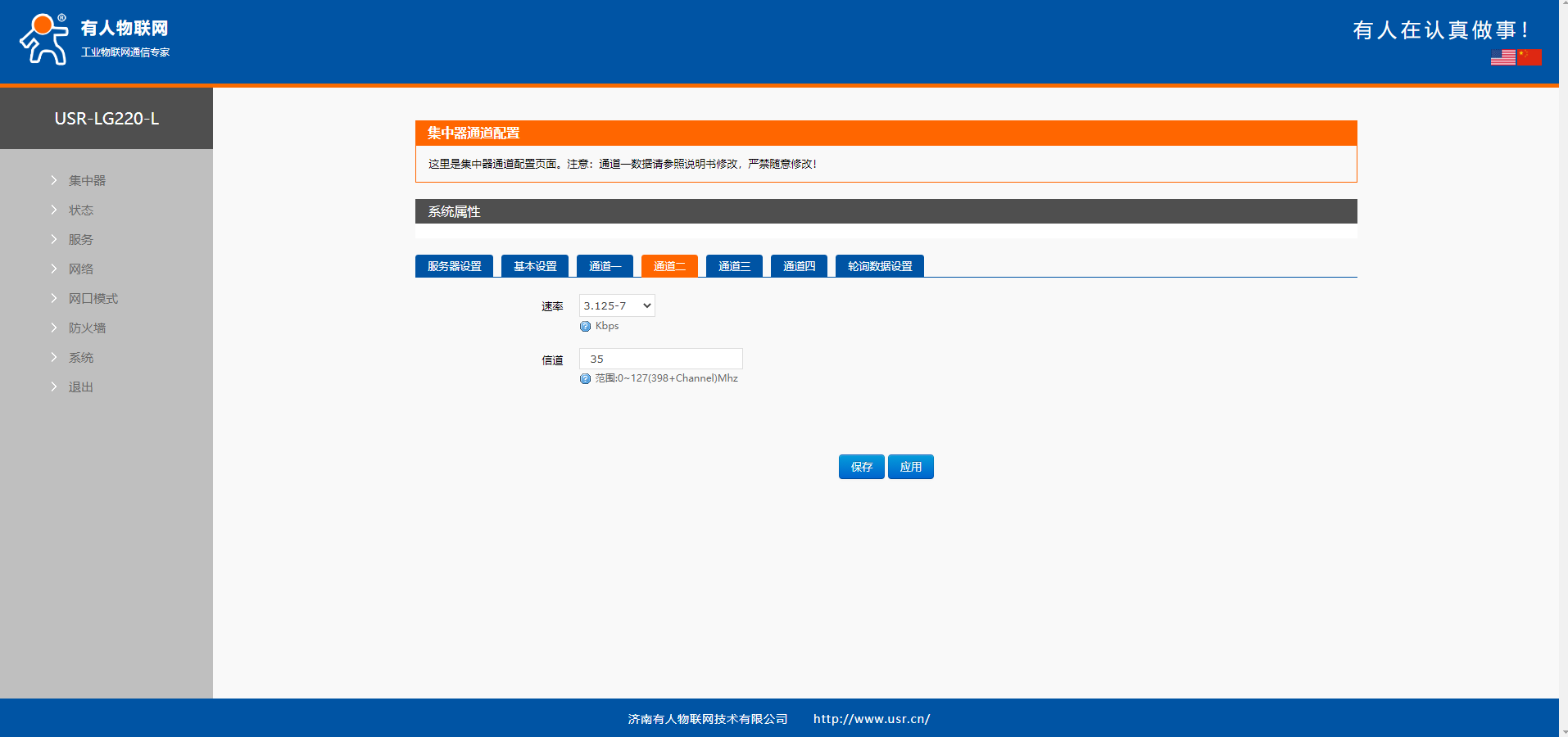 3、修改USR-IO34-LR-C的空中速率等級,設置為7。信道設置為35,和USR-LG220-L的通道一速率、信道保持一致。