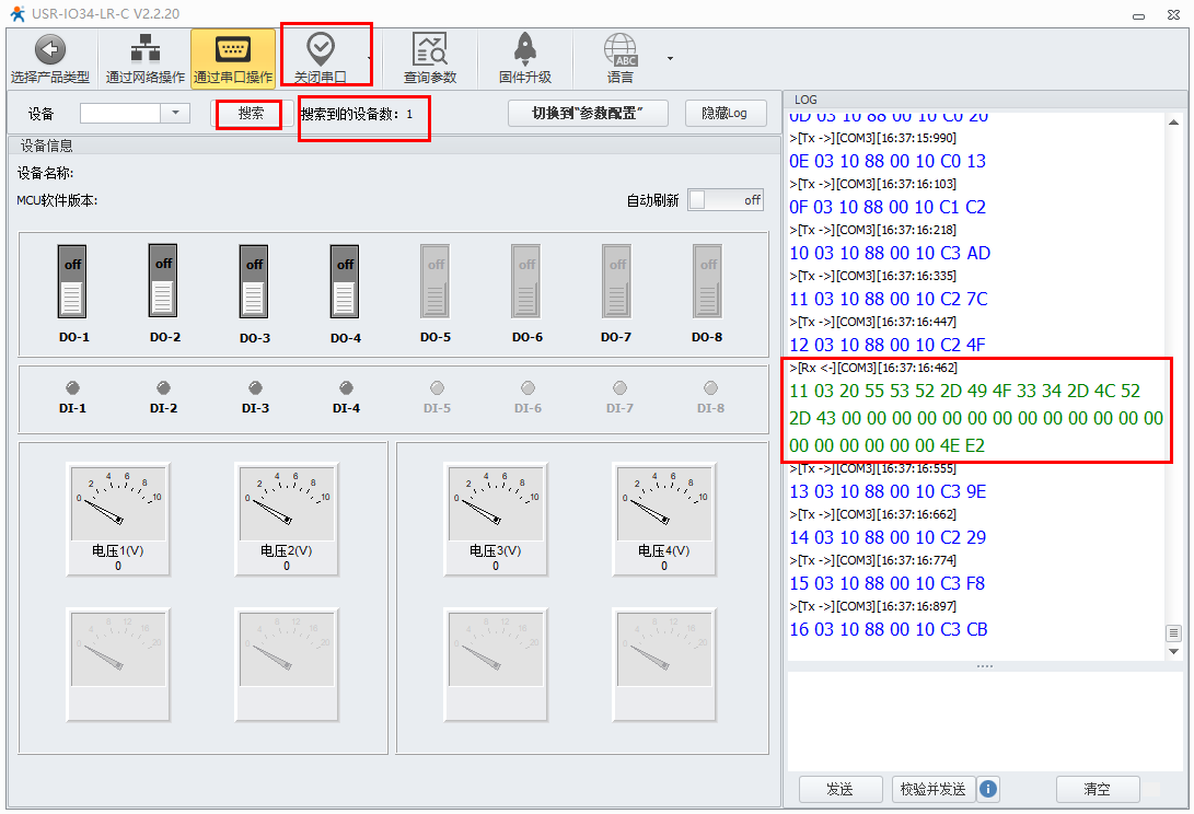 打開串口,用USB-RS485的COM口號打開,使用IO34-LR-C默認的串口參數(shù),9600,NONE,8,1