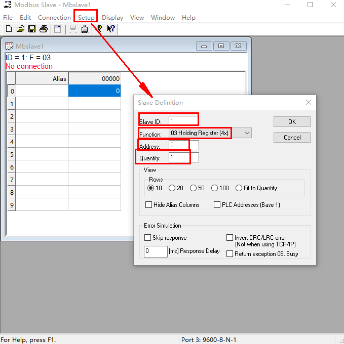 點擊Setup,設置從機地址,Slave ID 設置485從機地址1,F(xiàn)unction用03功能碼,Address是寄存器起始地址用0,Quantity設置從寄存器起始開始的寄存器數(shù)量,用1。
