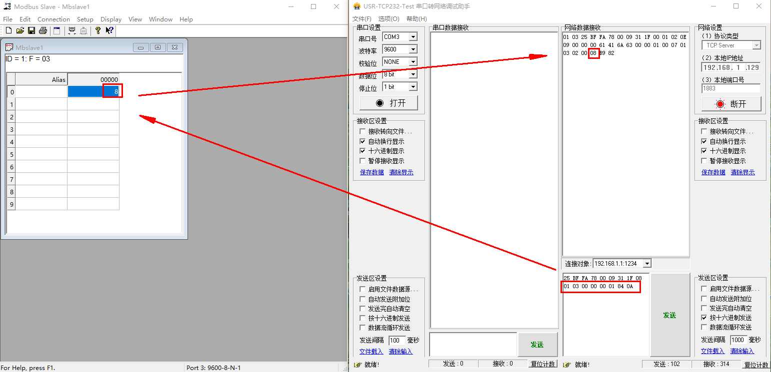 網(wǎng)絡端發(fā)送和接收都勾選十六進制顯示和接收,然后網(wǎng)絡端按照USR-LG220-L的服務器主動下發(fā)協(xié)議,輸入命令,去讀取USR-IO34-LR-C 接的485從機地址1,寄存器地址0的數(shù)據(jù)。