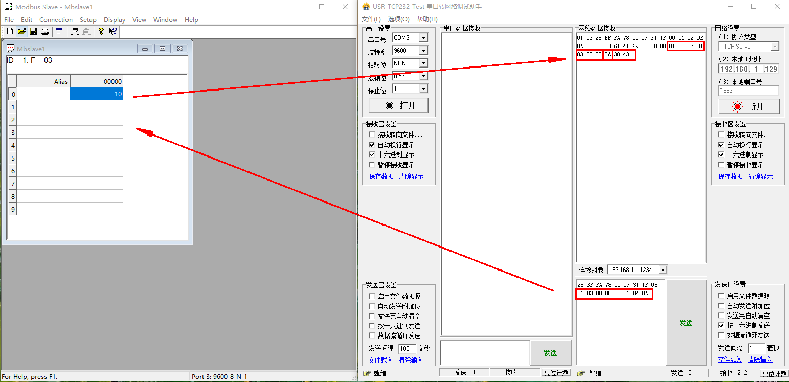 1、USR-IO34-LR-C 使用USB-RS485接電腦,電腦安裝并打開MODBUS SLAVE軟件,模擬MODBUS RTU 485串口設備。
