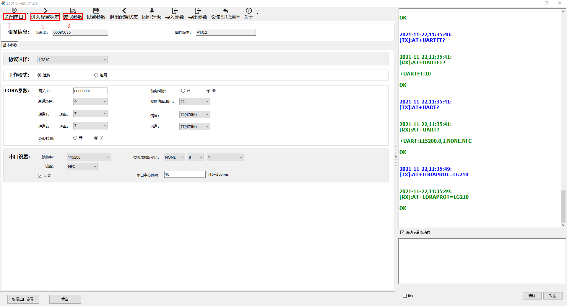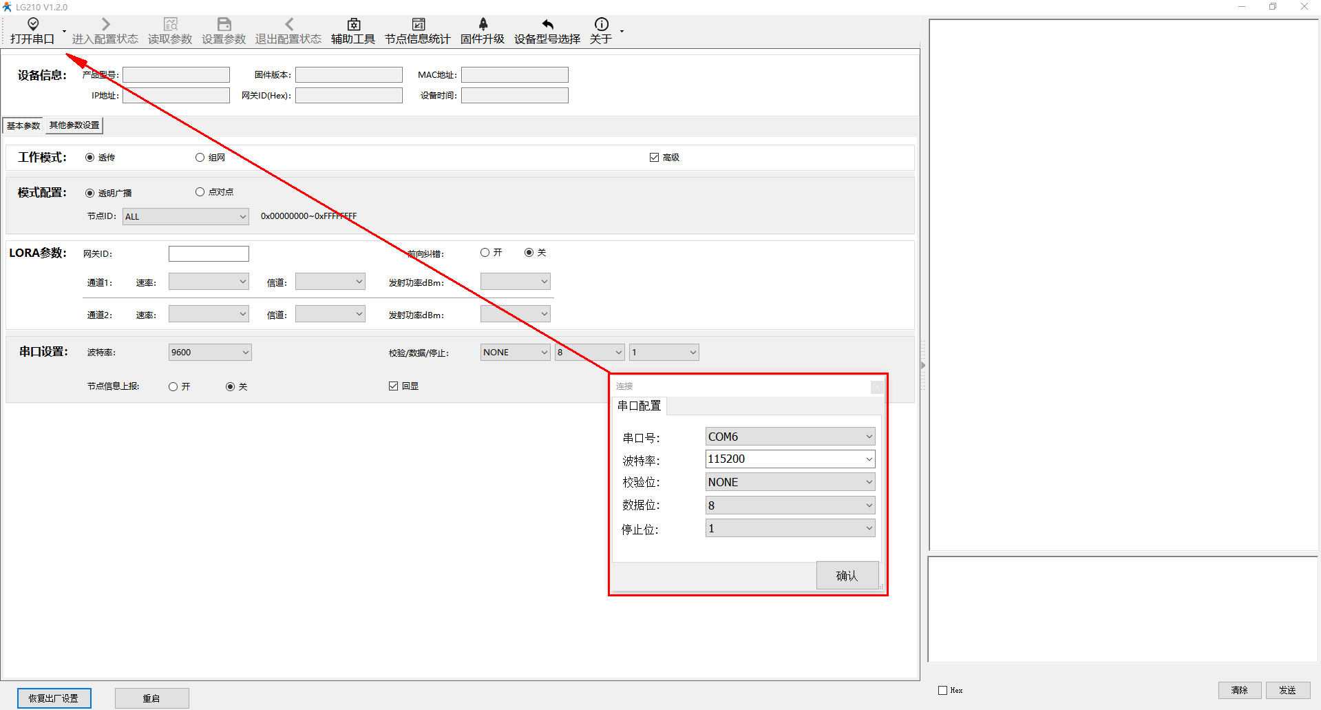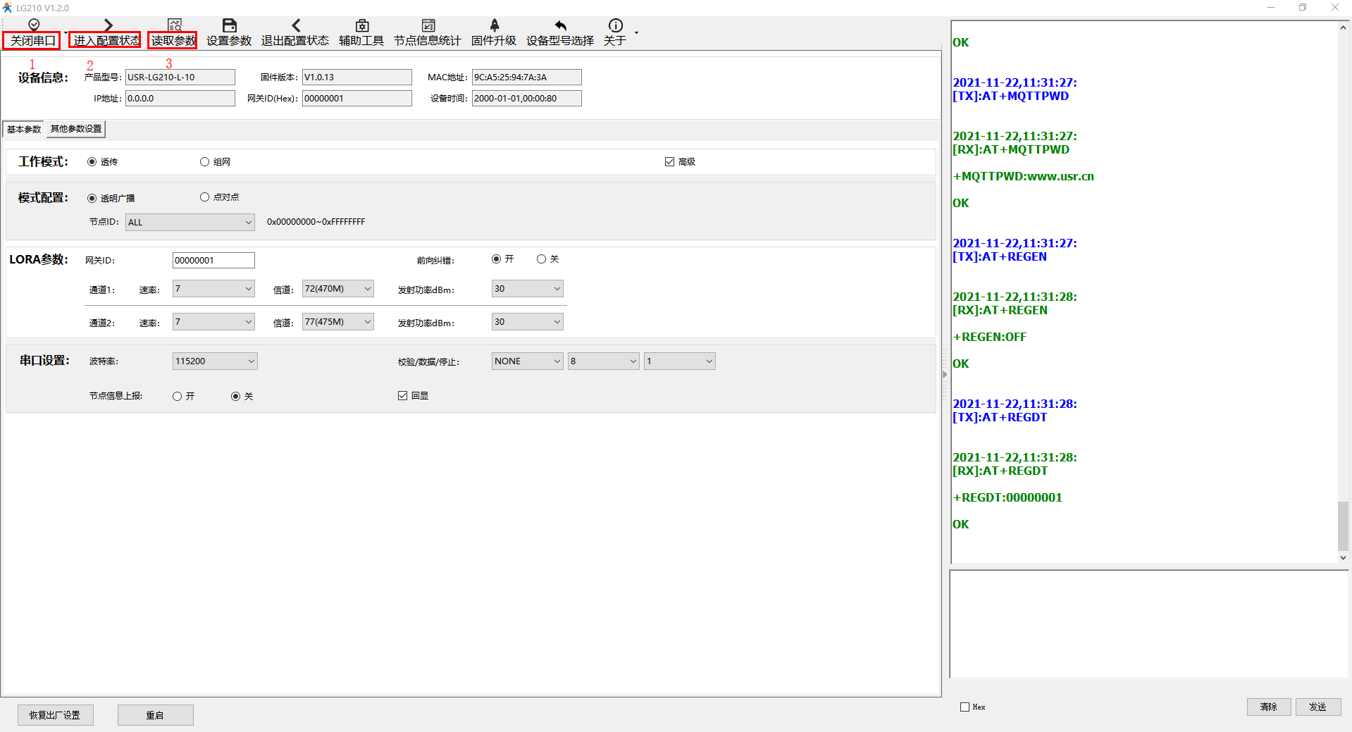 1、電腦打開USR-LG210的設(shè)置軟件,打開串口,點(diǎn)擊進(jìn)入配置狀態(tài),讀取參數(shù)。