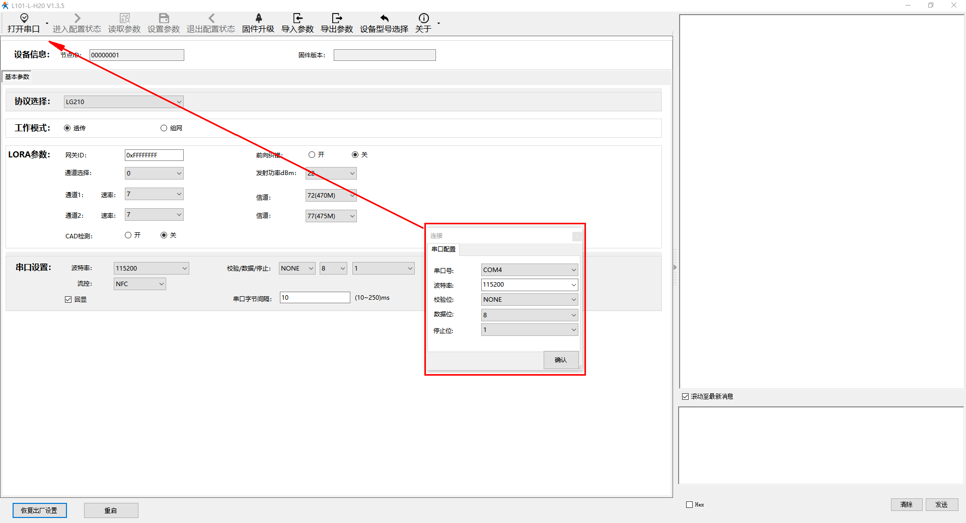 2、用默認(rèn)串口參數(shù)打開串口COM4,點(diǎn)擊進(jìn)入配置狀態(tài),讀取參數(shù)。