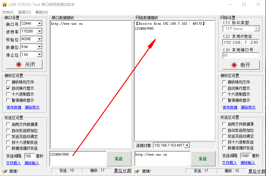 電腦打開1個(gè)USR-TCP232-TEST串口軟件,左側(cè)打開對(duì)應(yīng)WH-L101-L-H20的USB-RS232串口線COM口號(hào),右側(cè)做TCPserver,本地IP地址填電腦IP地址,本地端口號(hào)填60。