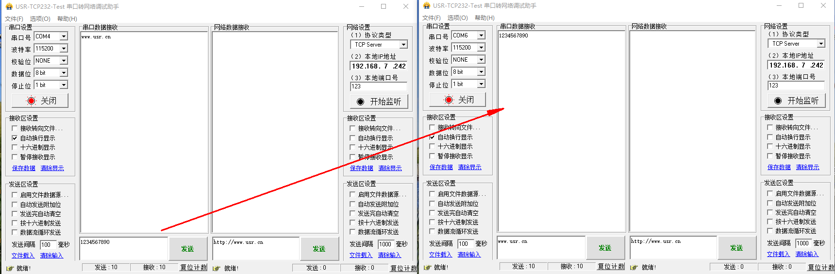 電腦打開2個(gè)USR-TCP232-TEST串口軟件,打開對(duì)應(yīng)WH-L101-L-H20和USR-LG210的USB-RS232串口線COM口號(hào),WH-L101-L-H20串口發(fā)送數(shù)據(jù),USR-LG210串口接收數(shù)據(jù)。