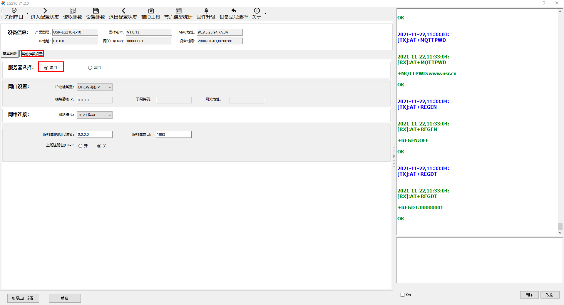 1、電腦打開USR-LG210的設(shè)置軟件,打開串口,點擊進入配置狀態(tài),讀取參數(shù)。