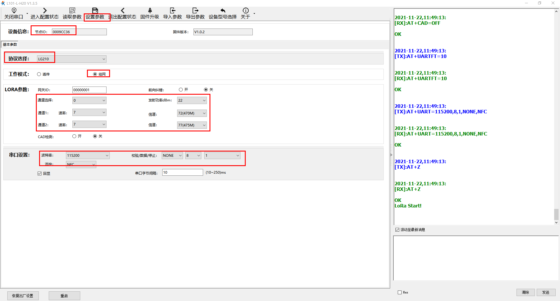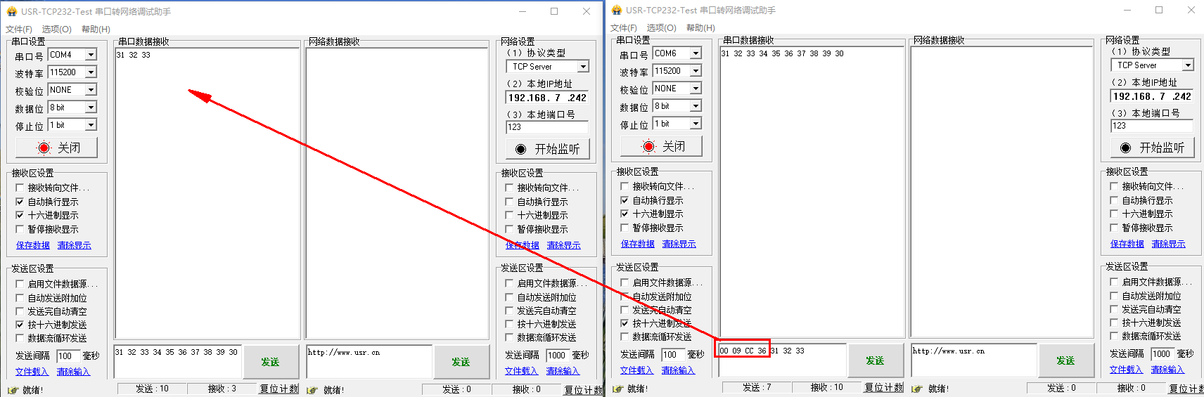電腦打開2個USR-TCP232-TEST串口軟件,打開對應(yīng)WH-L101-L-H20和USR-LG210的USB-RS232串口線COM口號,USR-LG210串口發(fā)送十六進制數(shù)據(jù),數(shù)據(jù)前面帶節(jié)點ID,WH-L101-L-H20串口接收十六進制數(shù)據(jù)。這樣USR-LG210可以指定向WH-L101-L-H20發(fā)送數(shù)據(jù)。