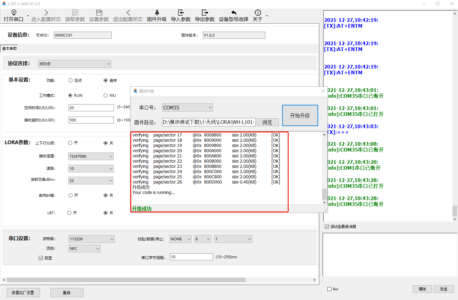 3、參數(shù)讀完點(diǎn)擊“固件升級(jí)”,選擇對應(yīng)COM串口,選擇固件路徑后直接給101-L斷電,按住“Reload”鍵不放(Reload管腳電平狀態(tài)持續(xù)拉低),給101設(shè)備上電,點(diǎn)擊“開始升級(jí)”。