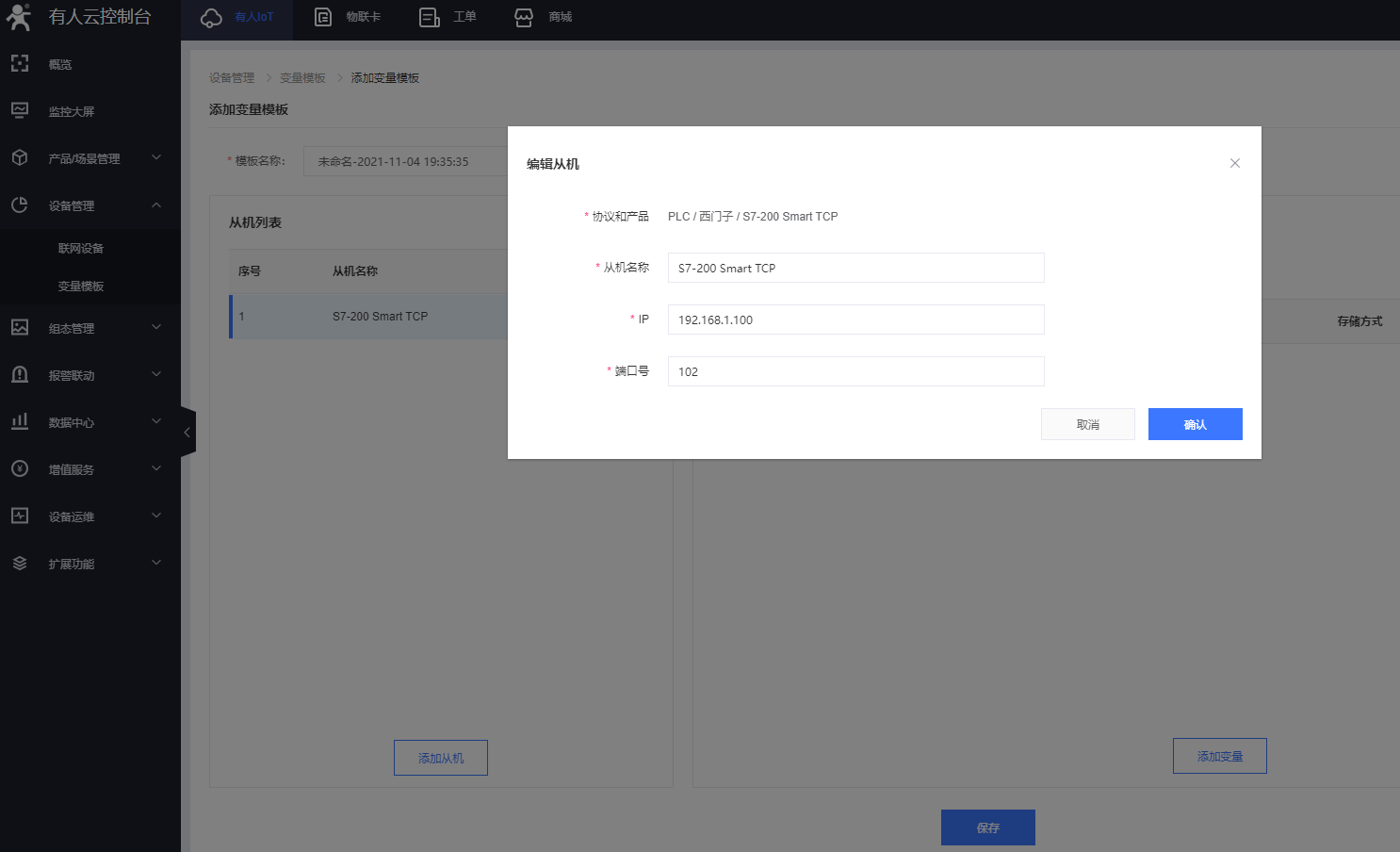 4. 選擇完模板后,點(diǎn)擊保存,重啟設(shè)備,然后配置從機(jī)和變量