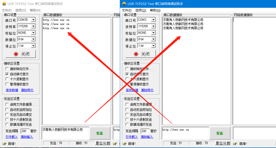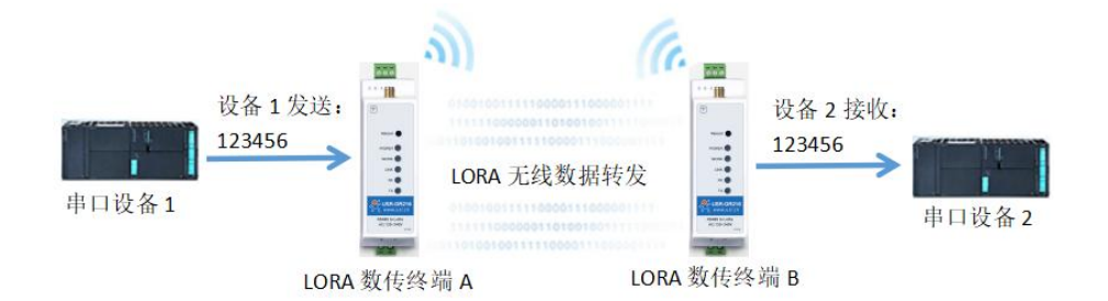 (3)啟動(dòng)兩個(gè)USR-TCP232-Test(模擬串口設(shè)備1,2)分別連接LoRa數(shù)傳終端A、B的串口,使用串口設(shè)備1發(fā)送數(shù)據(jù)串口設(shè)備2可接收數(shù)據(jù)(反之亦然),通信效果如下圖所示: