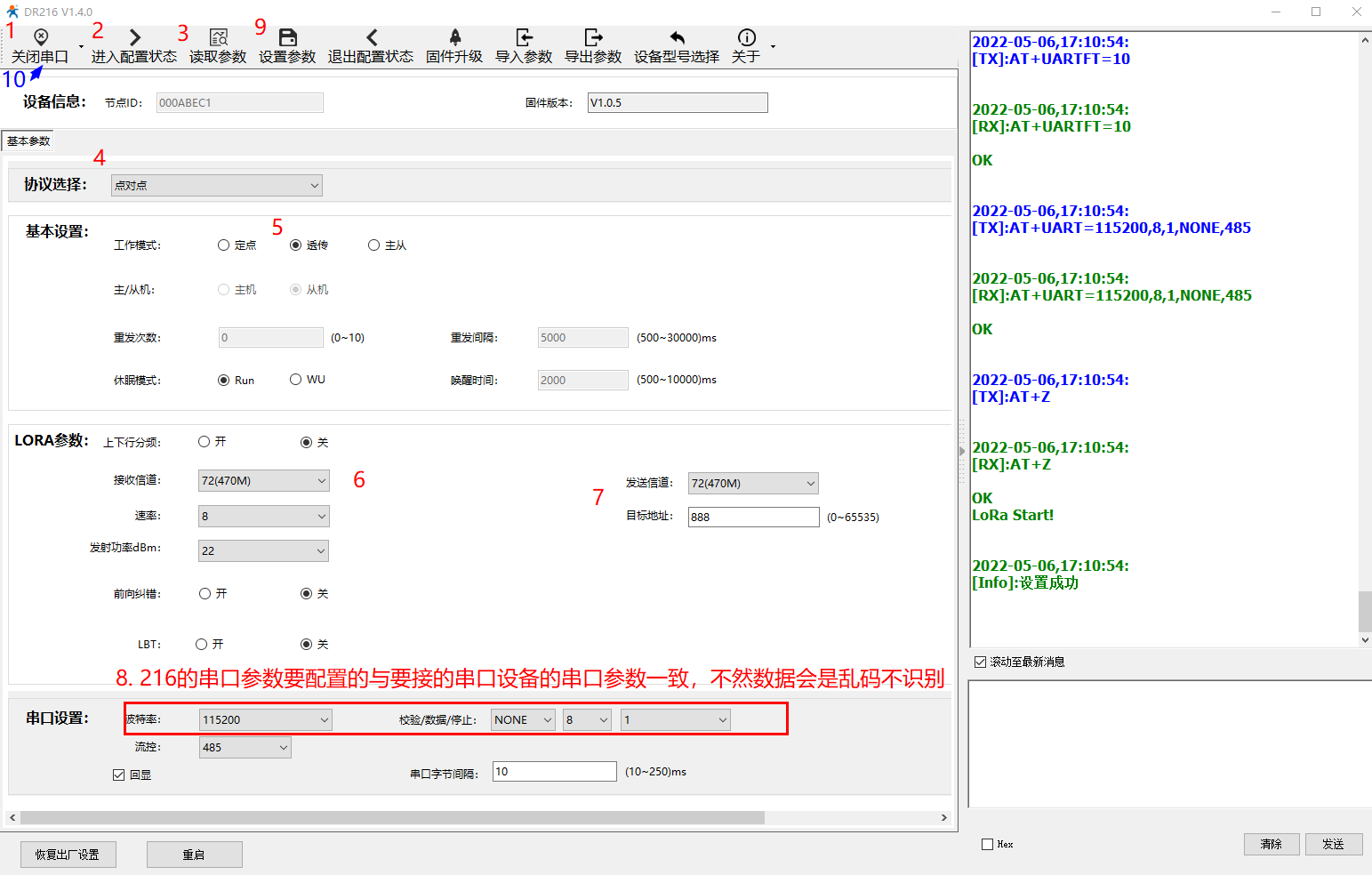 點(diǎn)擊打開串口(選擇A、B對(duì)應(yīng)的串口號(hào),DR216默認(rèn)串口參數(shù):115200,None,8,1,NFC)、進(jìn)入配置狀態(tài)、讀取參數(shù)、配置速率等級(jí)8,信道72,目標(biāo)地址888, 串口設(shè)置中的參數(shù)配置為您實(shí)際要連接的串口設(shè)備的串口參數(shù), 點(diǎn)擊設(shè)置所有參數(shù),關(guān)閉串口。