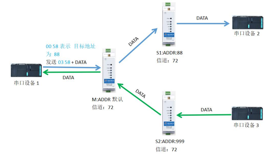當一臺主機 M(目標地址(ADDR):默認)向一臺從機 S1(目標地址(ADDR):88)發(fā)送數(shù)據(jù) DATA(123456), 則只需要按照 16 進制發(fā)送(00 58 31 32 33 34 35 36),則從機 S1 接收到數(shù)據(jù)(31 32 33 34 35 36);從機 S2 向主機 M 直接發(fā)送 DATA(31 32 33 34 35 36),主機 M 收到數(shù)據(jù) DATA(31 32 33 34 35 36)。通信過程如下圖所示: