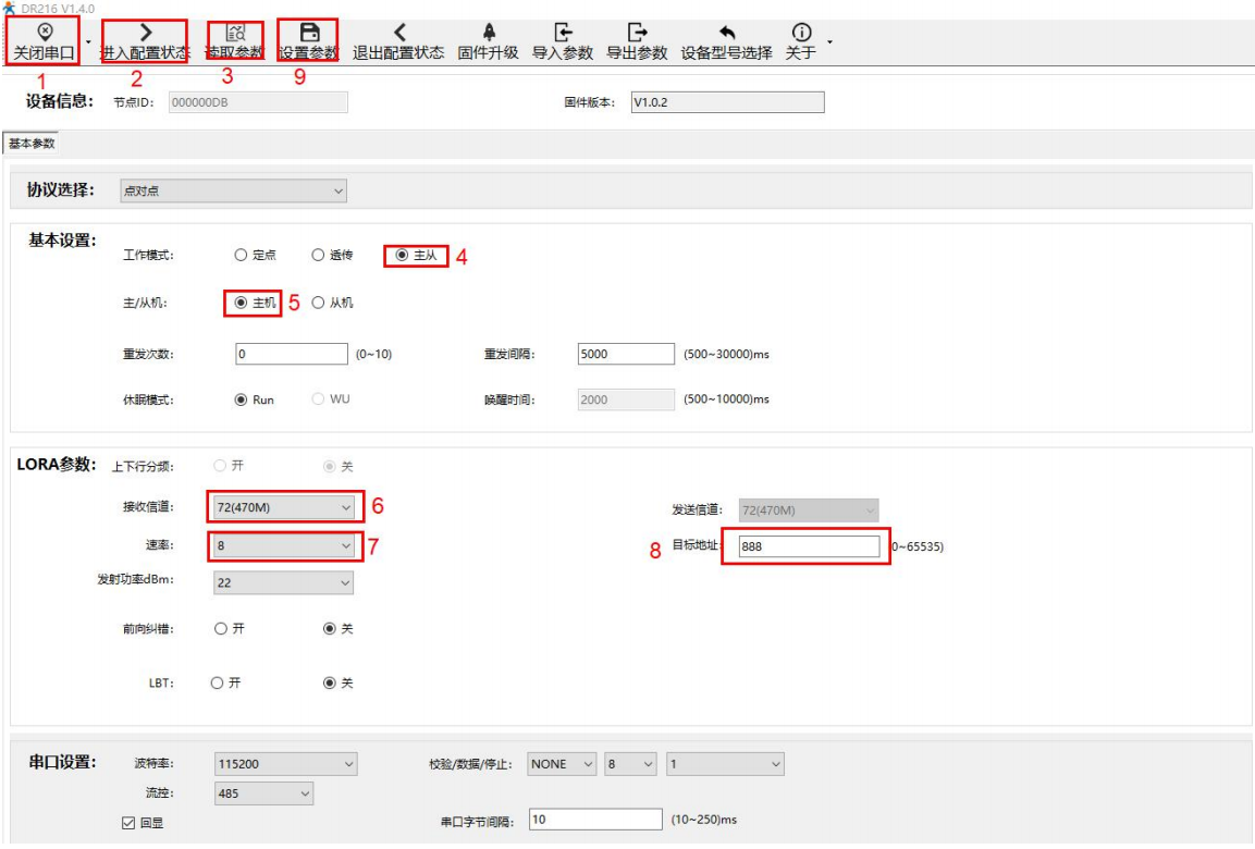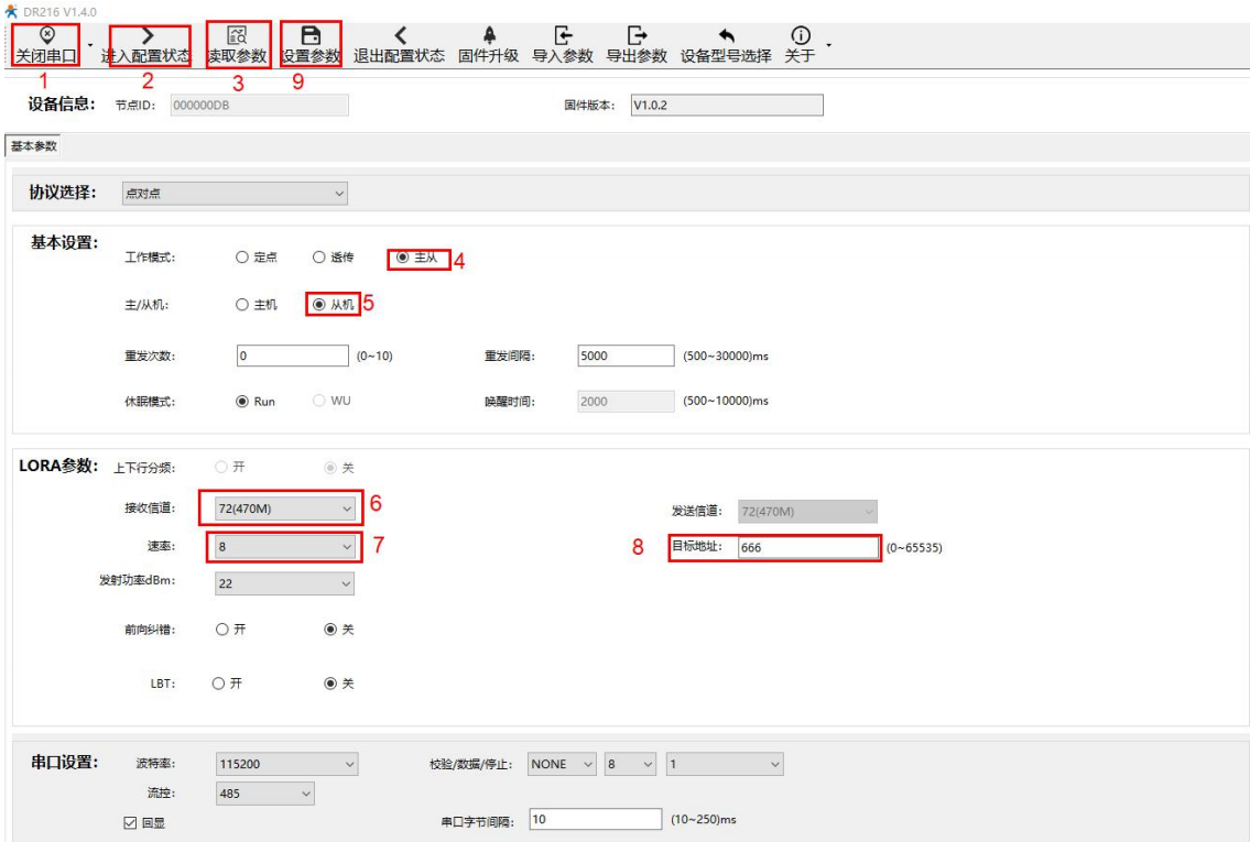 打開LoRa設置軟件,選擇LG216,依次點擊打開串口(選擇A、B對應的串口號,串口參數(shù):115200,None,8,1,NFC)、進入配置狀態(tài)、讀取參數(shù)、配置上表中的參數(shù)、一鍵設置所有參數(shù),關閉LoRa設置軟件。