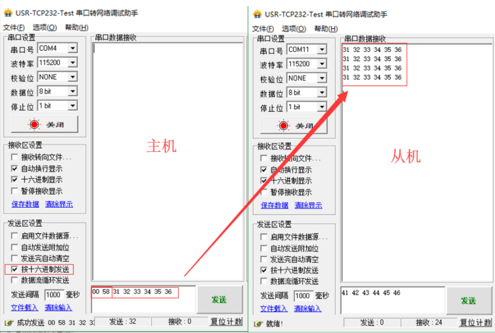 啟動兩個USR-TCP232-Test(模擬串口設備1,2)分別連接LoRa數(shù)傳終端A、B的串口,使用串口設備1發(fā)送數(shù)據(jù)串口設備2可接收數(shù)據(jù)(反之亦然),