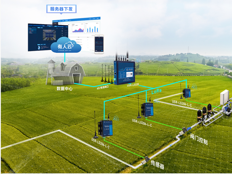 LG220選擇服務(wù)器下發(fā)功能,可快速實(shí)現(xiàn)遠(yuǎn)距離數(shù)據(jù)收發(fā),對(duì)灌溉、病蟲害、施肥情況在線監(jiān)測(cè),從而減少值守人員數(shù)量,全面提升農(nóng)場(chǎng)生產(chǎn)管理水平,提高經(jīng)濟(jì)效益,降低運(yùn)營(yíng)成本