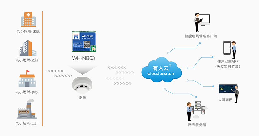 NB63支持低功耗工作模式,待機(jī)時(shí)間長,可全天候提供數(shù)據(jù)傳輸;NB-IoT可連接的終端數(shù)量多,滿足海量煙感器同時(shí)接入;同時(shí),NB-IoT適合狹小、逼仄場景安裝使用,信號(hào)穿透強(qiáng),免布線安裝,節(jié)省項(xiàng)目開支
