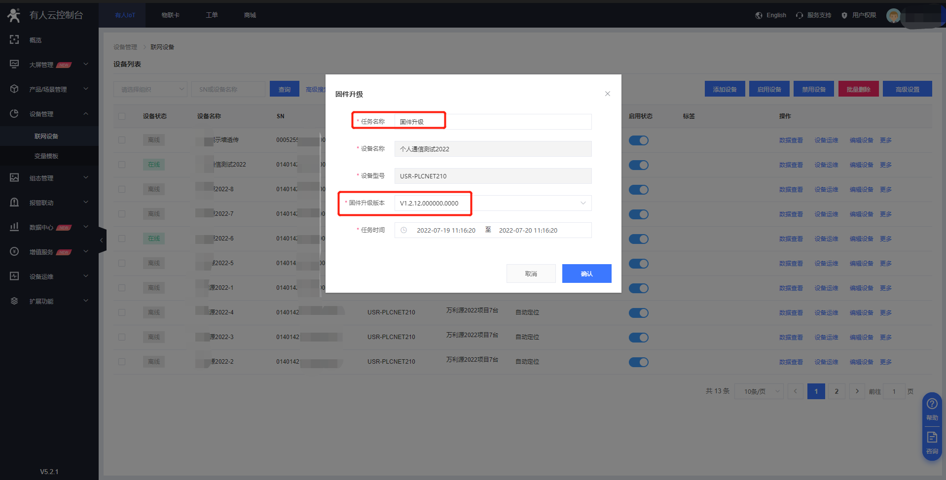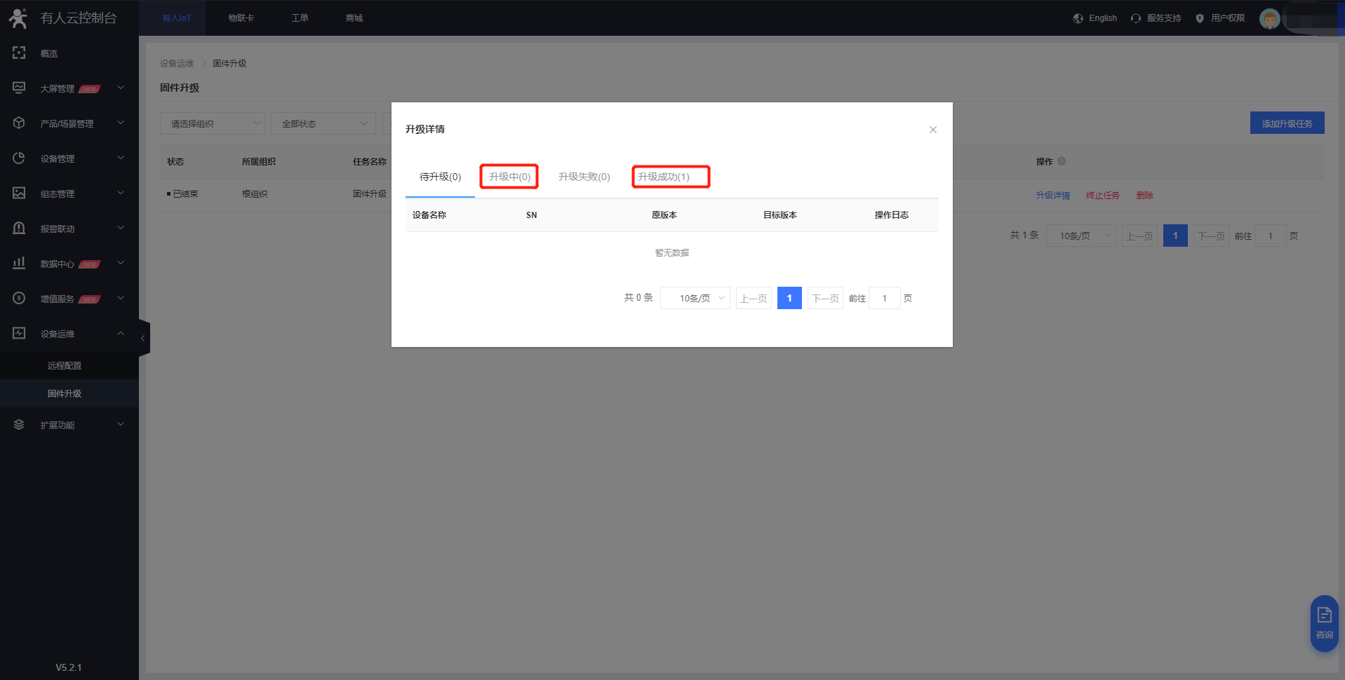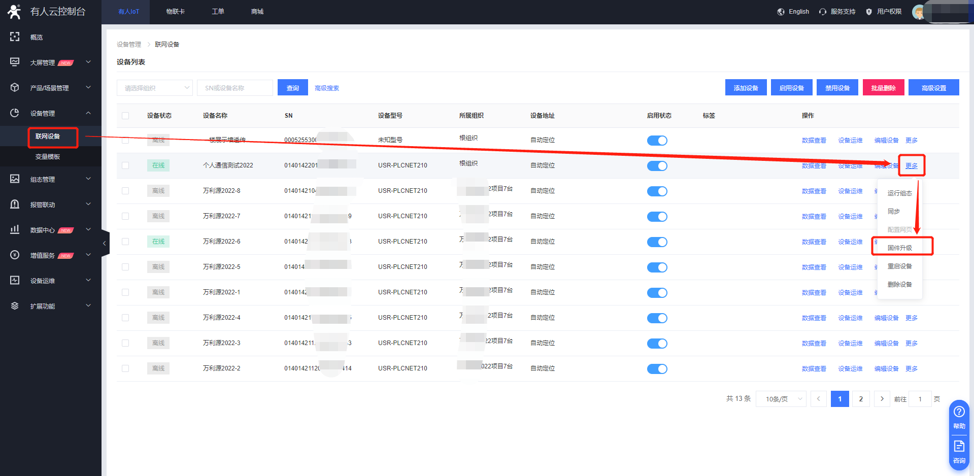 2. 設(shè)備管理--聯(lián)網(wǎng)設(shè)備--更多--固件升級(jí)