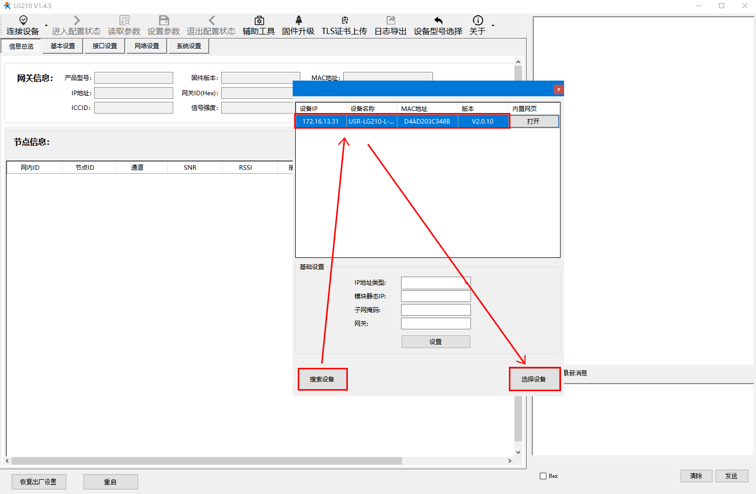 2、下載并解壓LORA設(shè)置軟件,確定LG210網(wǎng)口接入網(wǎng)絡(luò)后是與電腦同一局域網(wǎng)的。在文件夾中選擇USR_LoRa.exe可執(zhí)行文件雙擊打開,協(xié)議選擇私有協(xié)議,型號選擇LG210,點(diǎn)擊“連接設(shè)備”按鈕旁的下三角箭頭,選擇“網(wǎng)絡(luò)連接”>“搜索設(shè)備”>選擇對應(yīng)LG210點(diǎn)擊“選擇設(shè)備”。