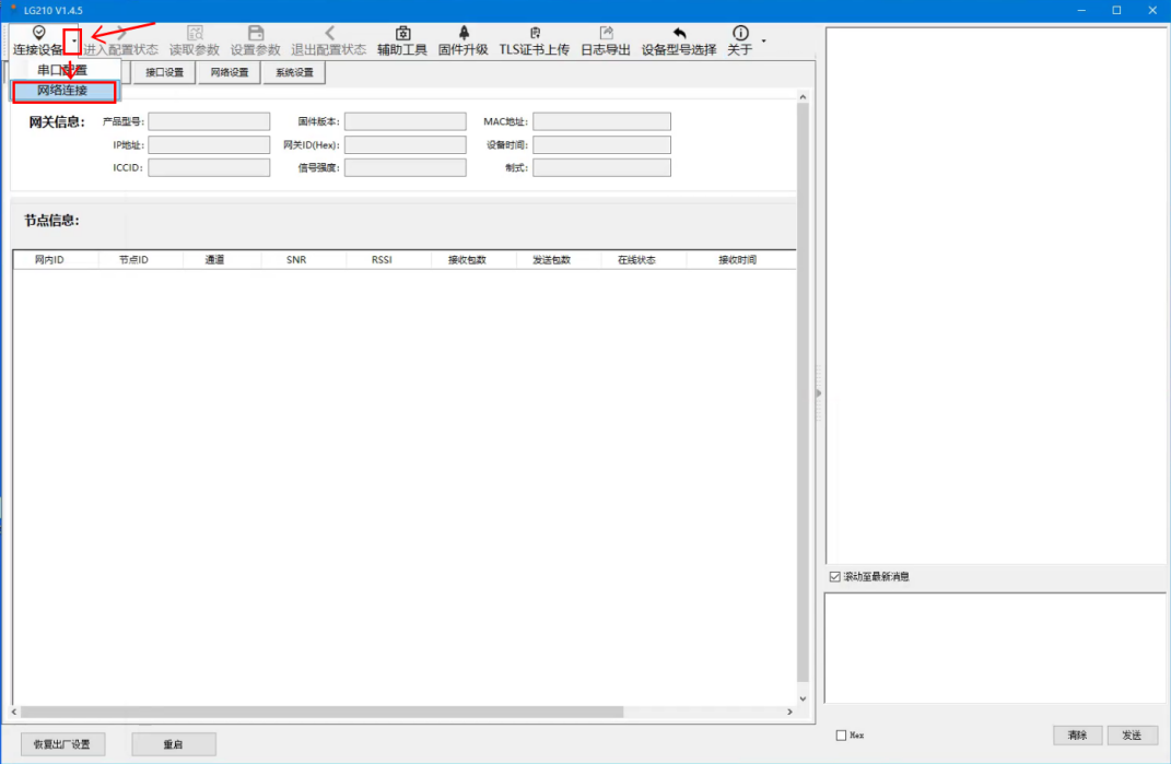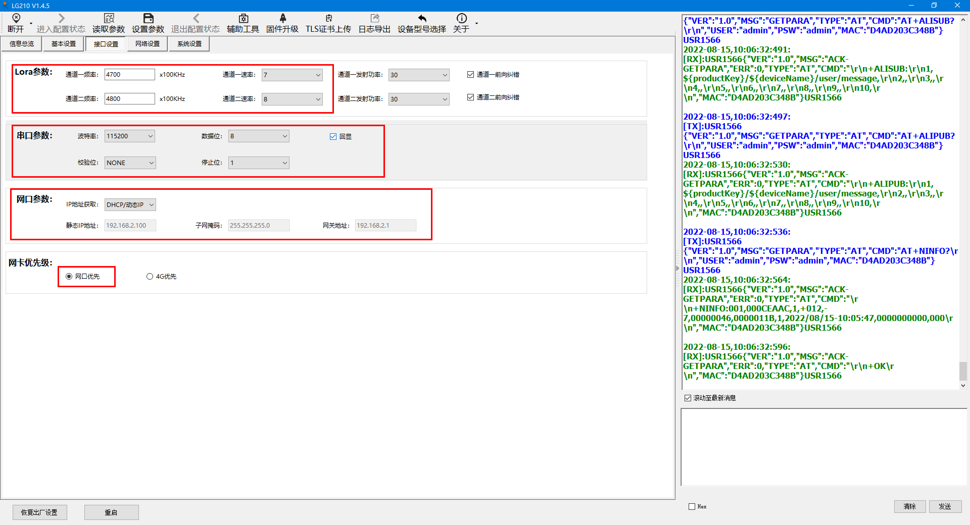 網(wǎng)口參數(shù)LG210默認(rèn)為DHCP自動獲取ip,若需要LG210做靜態(tài)ip的話,可以自行修改,本次測試為自動獲取獲取ip。