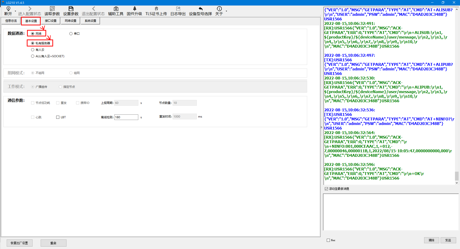 點(diǎn)擊“讀取參數(shù)”后, 將協(xié)議選擇配置為“LG210”,工作模式配置為“組網(wǎng)”,LORA參數(shù) - 網(wǎng)關(guān)ID配置為LG210的網(wǎng)關(guān)ID;