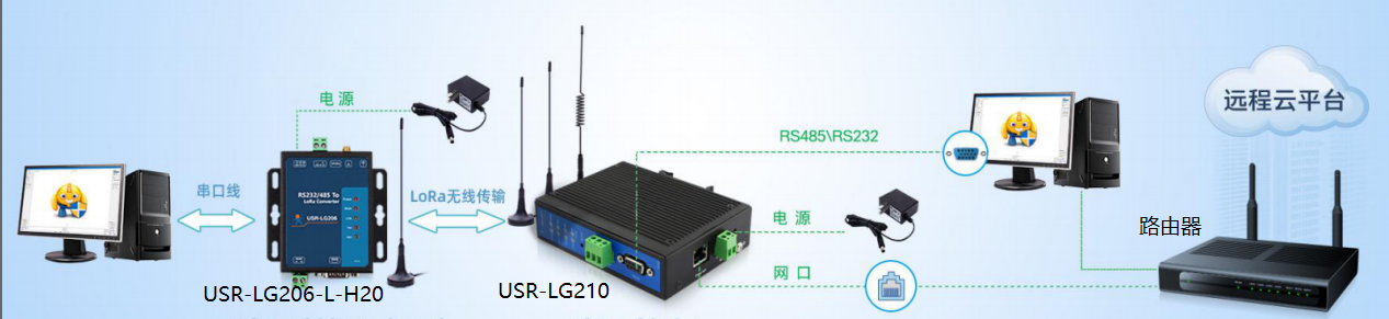 LG210與lora節(jié)點(diǎn)(USR-LG206-L-H20)安裝天線,使用各自配套電源適配器供電, LG206串口連接電腦,LG210網(wǎng)口連接路由器或者交換機(jī),電腦也接入該路由器或交換機(jī)。