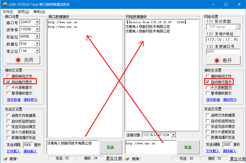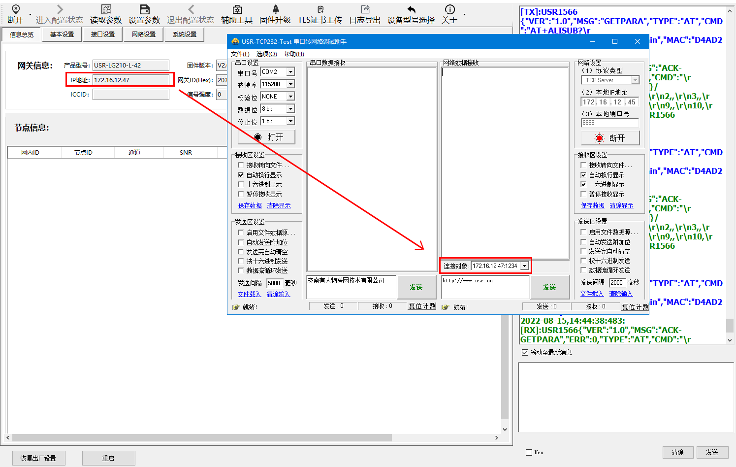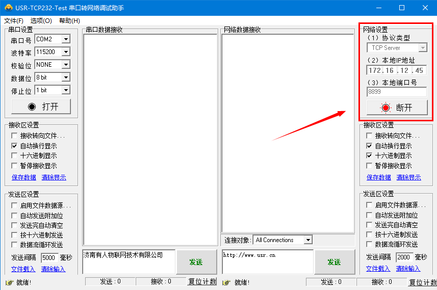 在USR-TCP232-Test軟件的串口端打開206的串口, 互發(fā)數(shù)據(jù)便可通信了。