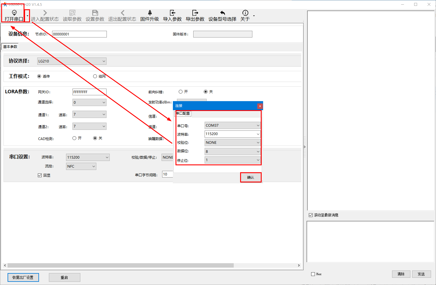 7、配置USR-LG206-L-H20,LG206的串口通過232或者485轉(zhuǎn)usb的串口線接電腦,lora設(shè)置軟件選擇產(chǎn)品型號對應(yīng)lora型號,點(diǎn)擊確認(rèn),打開對應(yīng)串口的com號,串口參數(shù)默認(rèn)是115200、none\8\1。