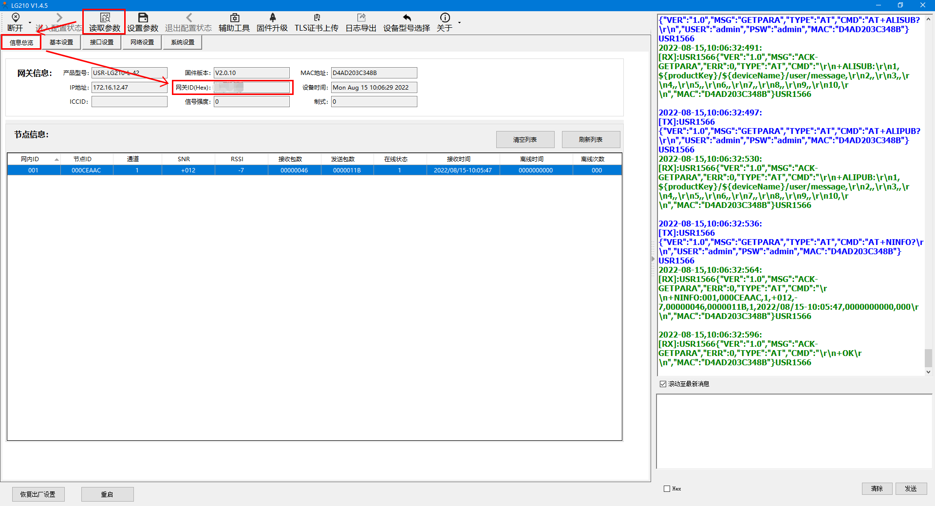 3、點(diǎn)擊“讀取參數(shù)”,在信息總覽中復(fù)制保存網(wǎng)關(guān)ID,之后配置LORA節(jié)點(diǎn)LG206組網(wǎng)時(shí)用的到。