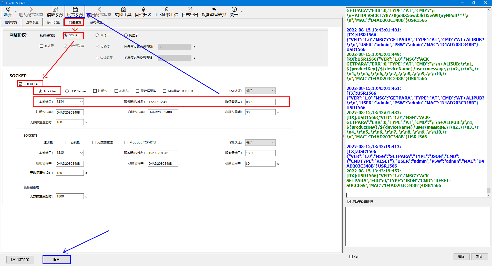 服務(wù)器IP/配置為服務(wù)器電腦的IP,服務(wù)器端口配置為服務(wù)器的端口號8899,點(diǎn)擊“設(shè)置參數(shù)”,點(diǎn)擊重啟設(shè)備,待設(shè)備重啟,服務(wù)器可以監(jiān)聽到該LG210連接。