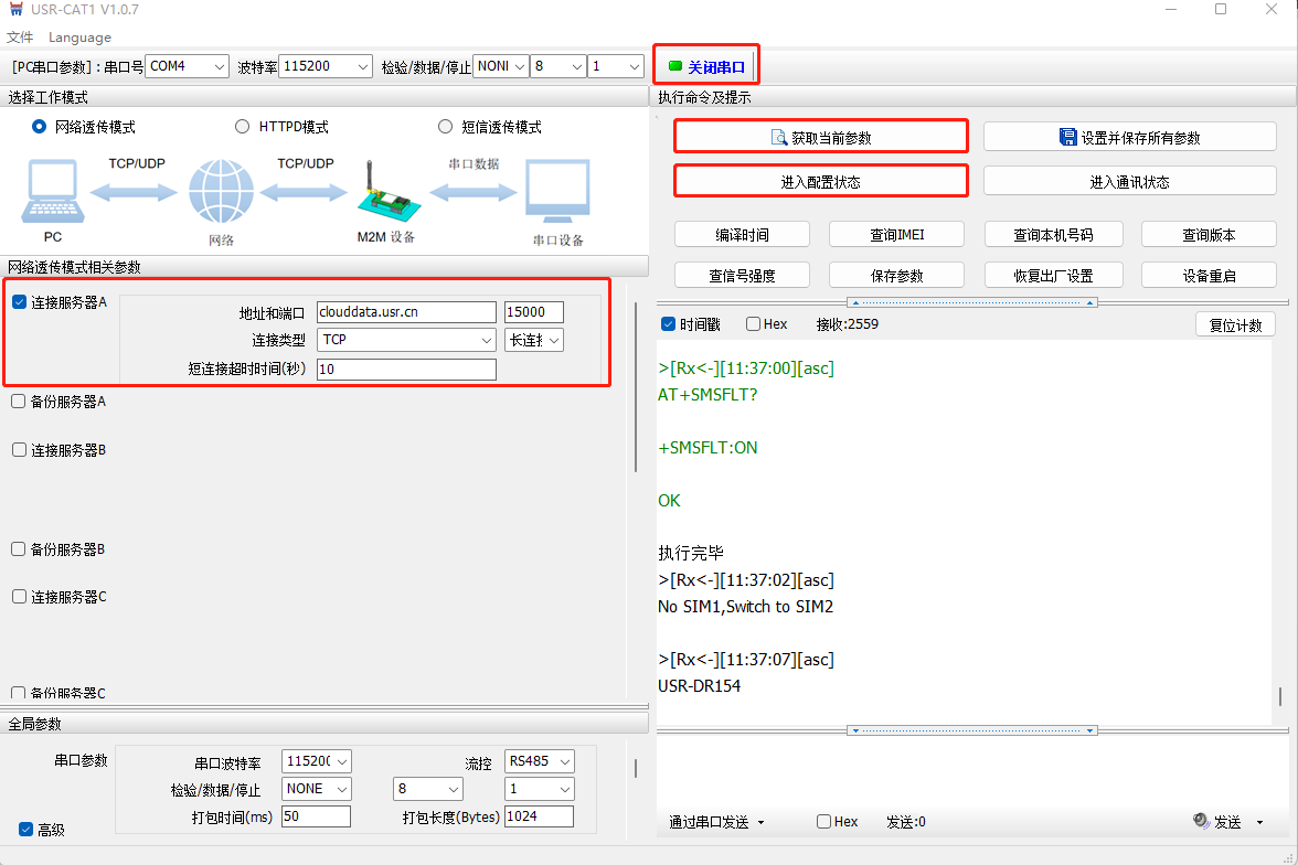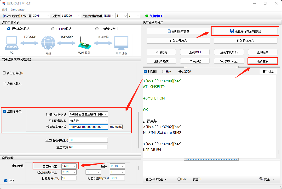2. USR-DR154通過USB轉(zhuǎn)485轉(zhuǎn)化器接到電腦上,使用上位機軟件將波特率修改至9600;服務(wù)器IP修改為clouddata.usr.cn和端口號修改為15000;注冊包選擇有人云,填寫云平臺分配的SN和通訊密碼;其他參數(shù)不變。設(shè)備重啟后即可在有人云上看到設(shè)備上線,兩臺USR-DR154均按照步驟1 2設(shè)置.給USR-DR154標(biāo)號為USR-DR154-1,USR-DR154-2.