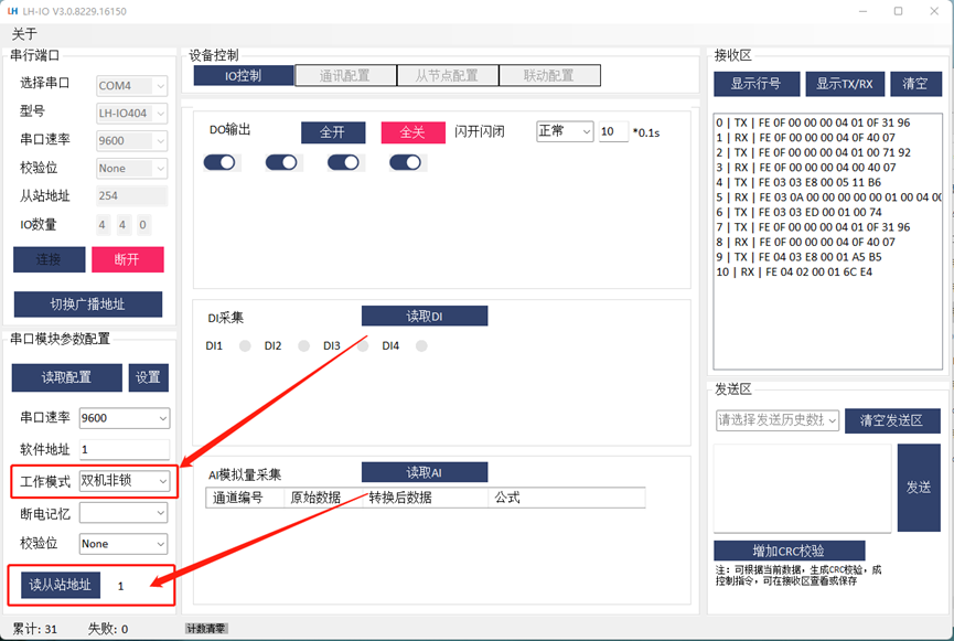 4. LH-IO404通過USB轉(zhuǎn)485轉(zhuǎn)換器接到電腦上,打開LH-IO404的上位機,測試?yán)^電器是否能正??刂?,并將繼電器的工作模式設(shè)置成雙機非鎖模式,設(shè)備地址默認(rèn)為1 ,4臺LH-IO404均為此設(shè)置。給LH-IO404標(biāo)號為LH-IO404-11, LH-IO404-12, LH-IO404-13, LH-IO404-2