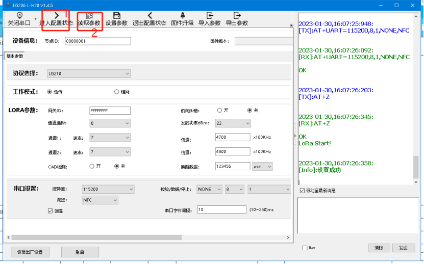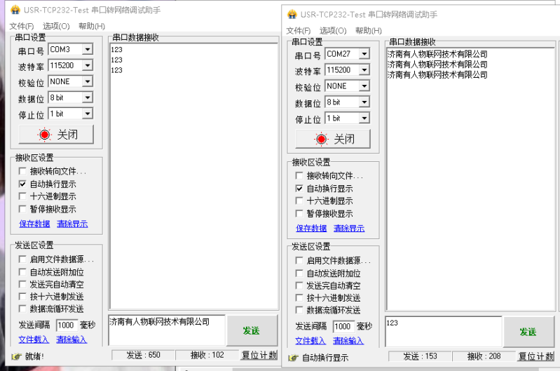 啟動兩個串口調(diào)試助手(模擬串口設(shè)備1,2)分別連接兩臺LORA設(shè)備的串口,使用串口設(shè)備1發(fā)送數(shù)據(jù)串口設(shè)備2可接收數(shù)據(jù)(反之亦然),通信效果如下圖所示: