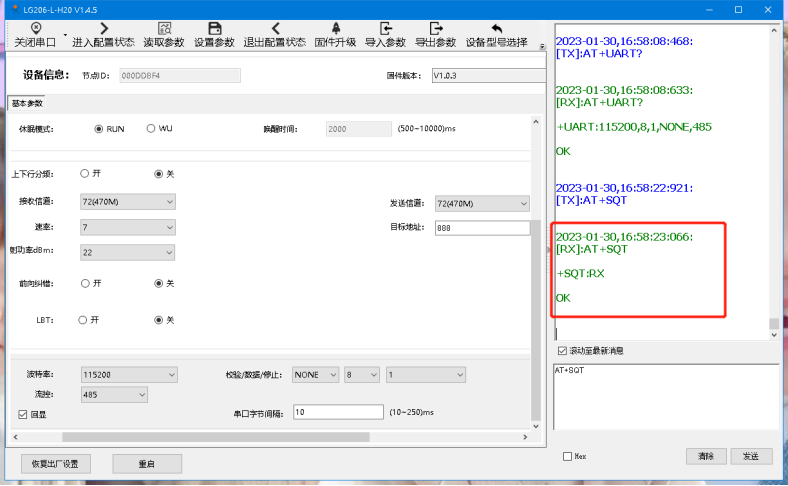 1、LORA傳輸設(shè)備A進(jìn)入命令模式發(fā)送AT+SQT進(jìn)入信號強度監(jiān)聽狀態(tài)