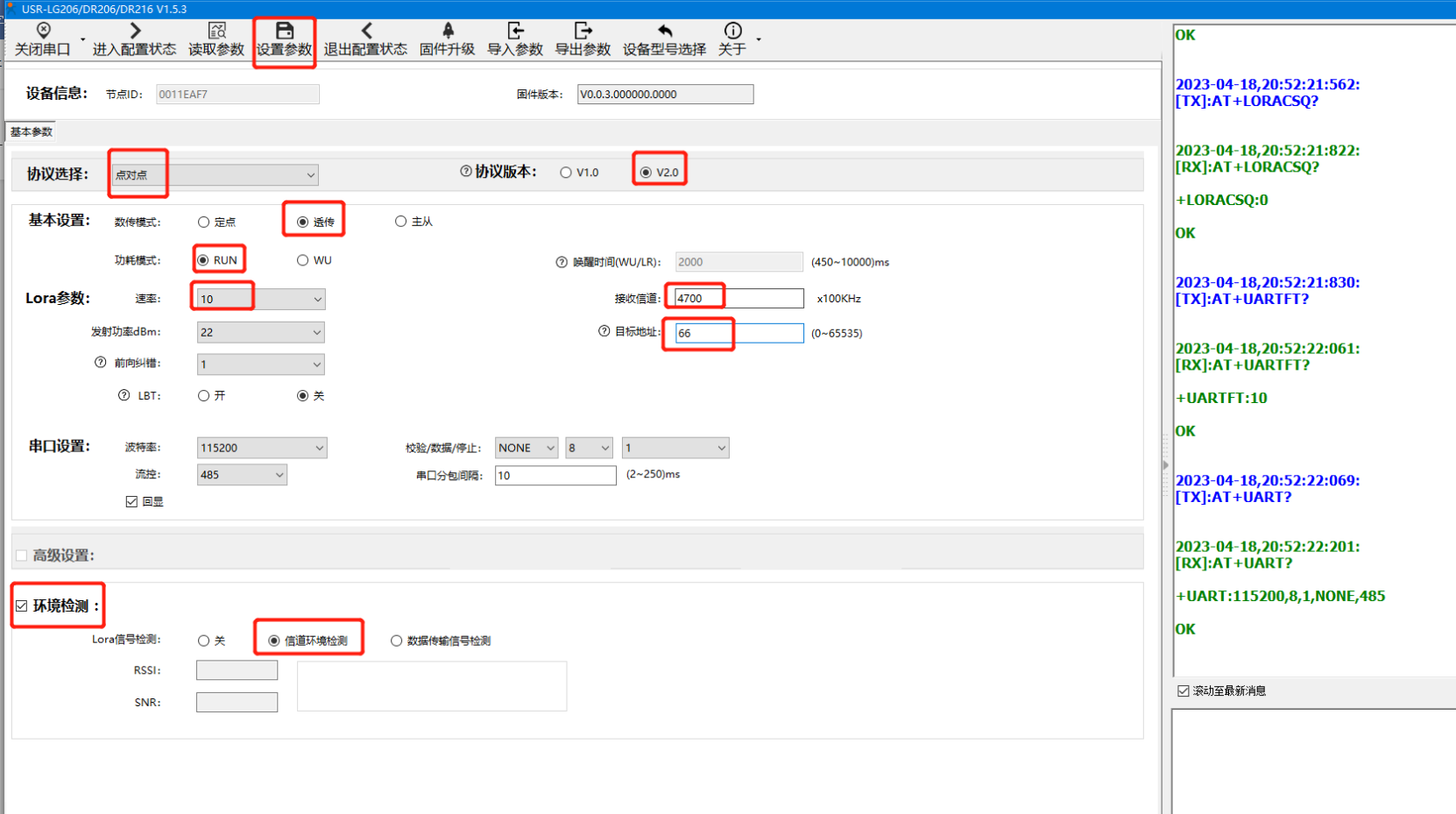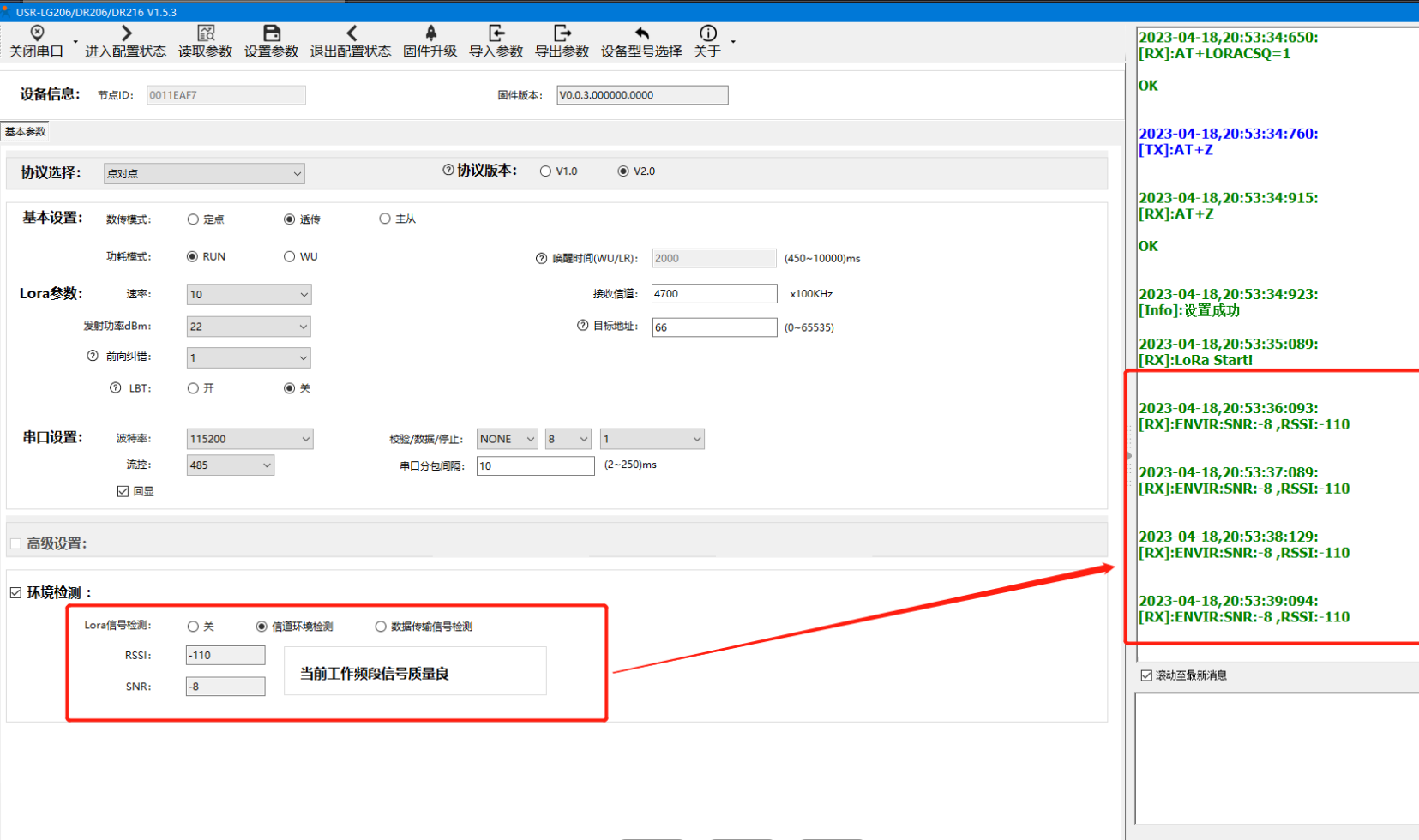 4)設置成功后,DR206會自動重啟。成功開啟該功能后,模組會間隔 1s 讀取當前環(huán)境下的信號質量,并間隔 3s 通過串口輸出(SNR\RSSI) 值,一般情況下 RSSI 值低于-100dBm、SNR 低于 0dB 意味著該工作頻段有其他物體干擾,那么就需更換頻段使用。