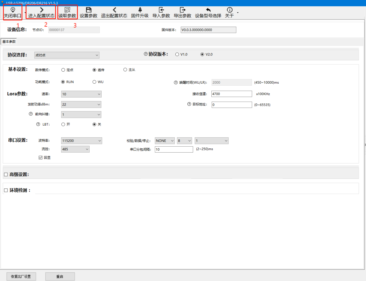 2)按照順序點擊“打開串口”---“進入配置狀態(tài)”---“讀取參數(shù)”