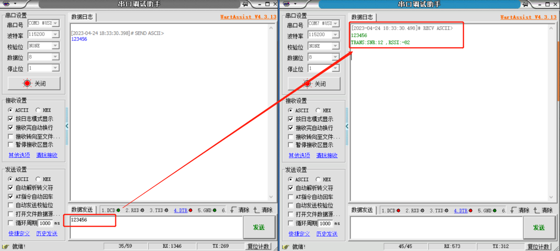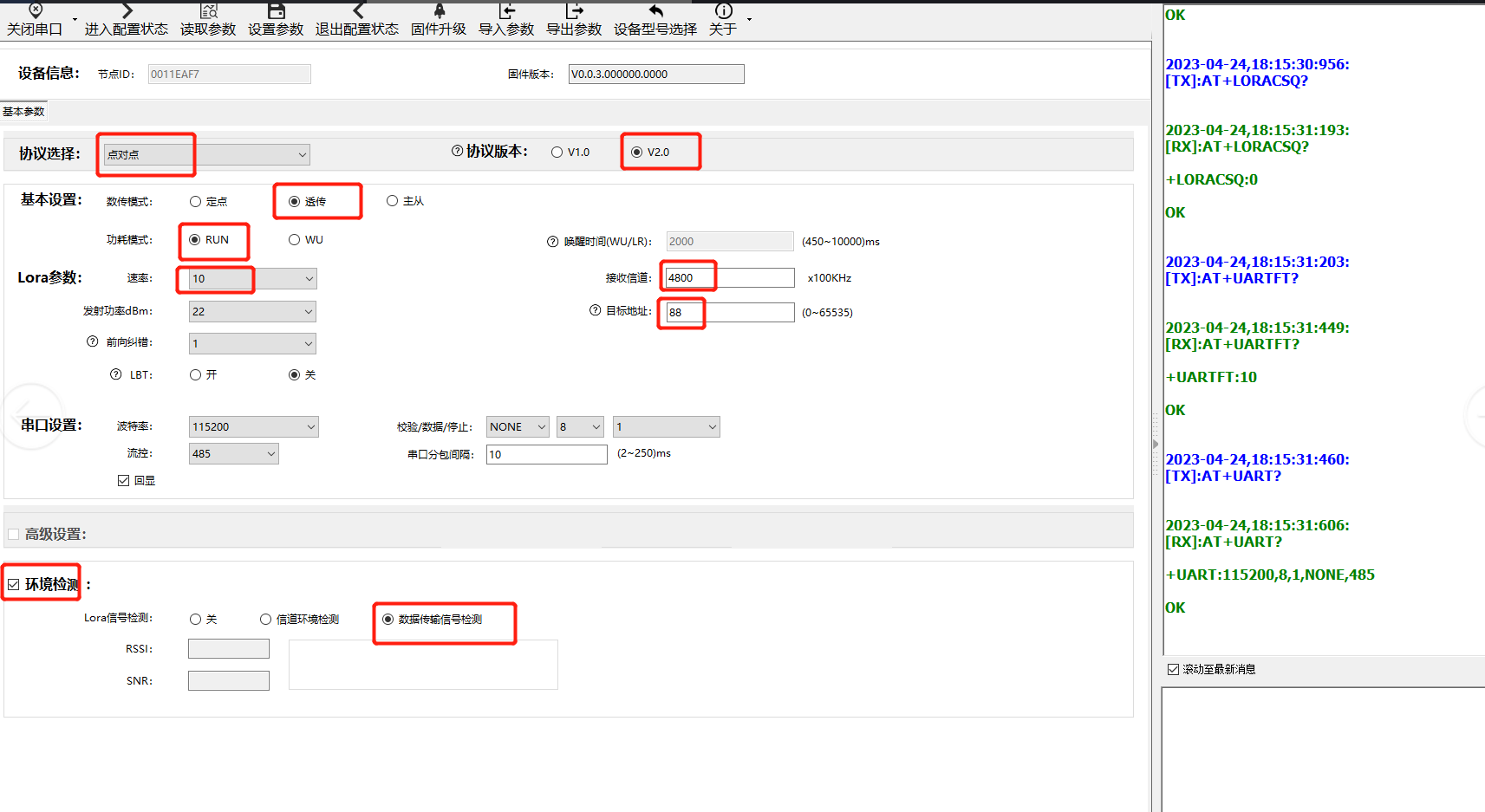 4)設(shè)置成功后,DR206會(huì)自動(dòng)重啟。成功開啟該功能后,模組會(huì)間隔 1s 讀取當(dāng)前環(huán)境下的信號(hào)質(zhì)量,并間隔 3s 通過串口輸出(SNR\RSSI) 值。一般情況下 RSSI 值低于-100dBm、SNR 低于 0dB 意味著該工作頻段有其他物體干擾,那么就需更換頻段使用。