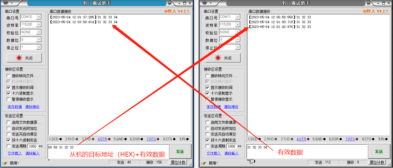 電腦打開2個串口調(diào)試助手軟件,打開兩個模塊對應(yīng)的USB-RS232/485串口線COM口號,主機(jī)端模塊串口發(fā)送16進(jìn)制的數(shù)據(jù)(數(shù)據(jù)格式:從機(jī)端目標(biāo)地址(HEX)有效數(shù)據(jù)),有效數(shù)據(jù)透傳給接收端串口。從機(jī)端可以直接給主機(jī)端模塊發(fā)送有效數(shù)據(jù)。