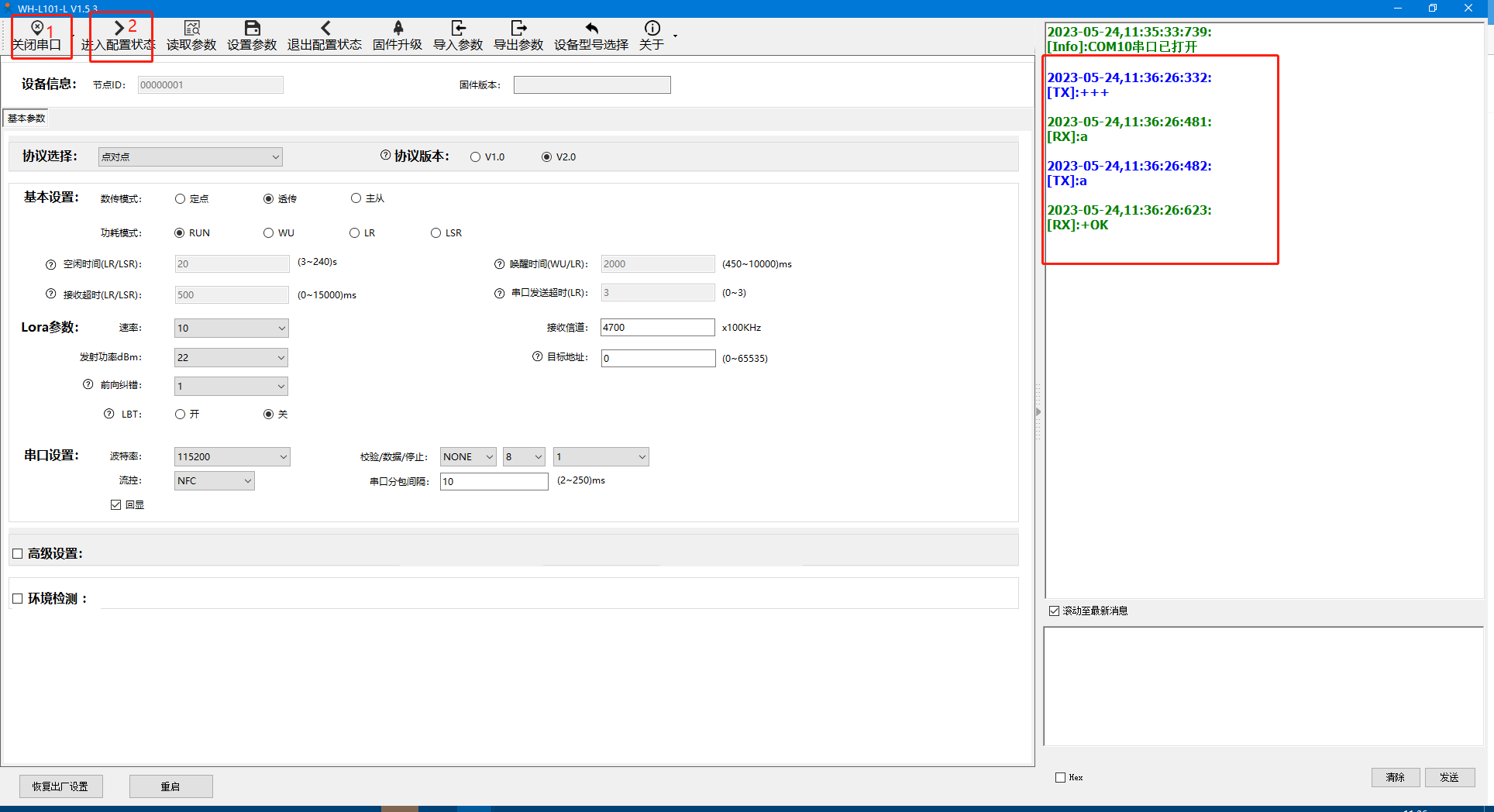 1、電腦下載并安裝WH-L101-L的設(shè)置軟件,選擇對應(yīng)的產(chǎn)品型號打開軟件。選擇對應(yīng)串口com10、com11,使用產(chǎn)品默認(rèn)的串口參數(shù)(115200 N 8 1)打開,點擊進(jìn)入配置狀態(tài)(返回a+ok說明成功進(jìn)入配置)然后讀取參數(shù)。