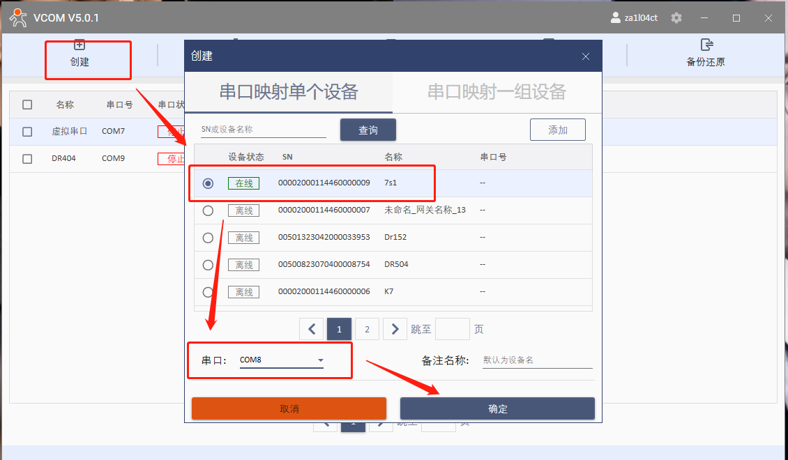 創(chuàng)建一個虛擬串口綁定網關7s1,定義一個串口號。