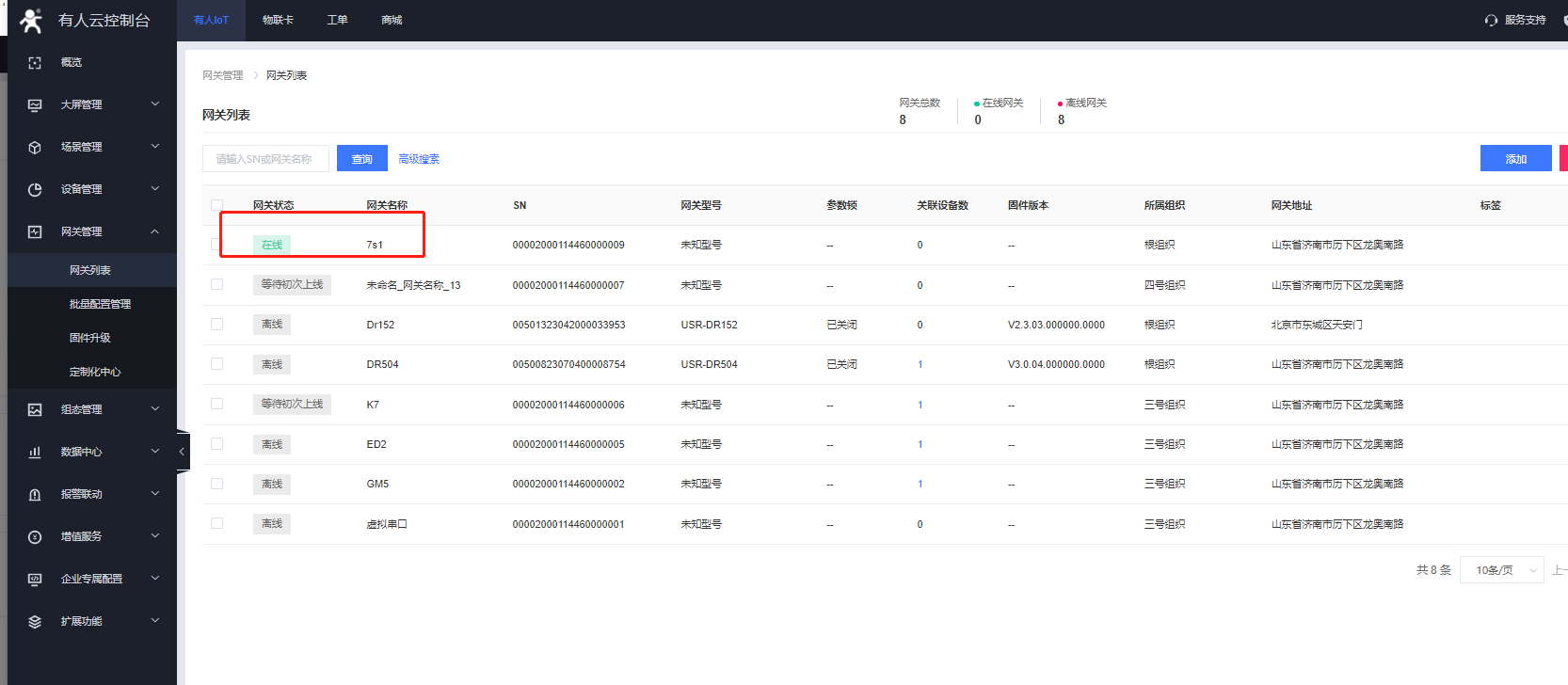 在網關管理---網關列表-添加網關,SN和MAC/IMEI可以點擊SN不支持,系統(tǒng)自動生成,不需要客戶自己設置,通訊密碼可以自定義8位密碼。