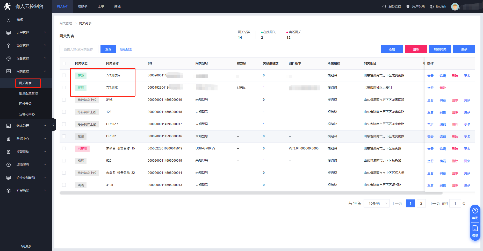 在網(wǎng)關(guān)管理---網(wǎng)關(guān)列表可以看到我們掃碼添加的兩臺G771設(shè)備,如果設(shè)備目前處于離線狀態(tài),可以檢查一下設(shè)備自身是否可以正常聯(lián)網(wǎng)。在設(shè)備正常聯(lián)網(wǎng)狀態(tài)下可以重啟下設(shè)備,可以看到設(shè)備的在線信息。