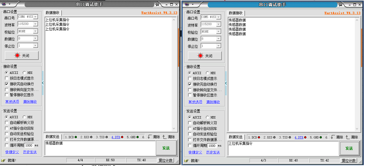 說明:本案例中,串口設(shè)備以及上位機(jī)均用串口調(diào)試助手軟件模擬來測試