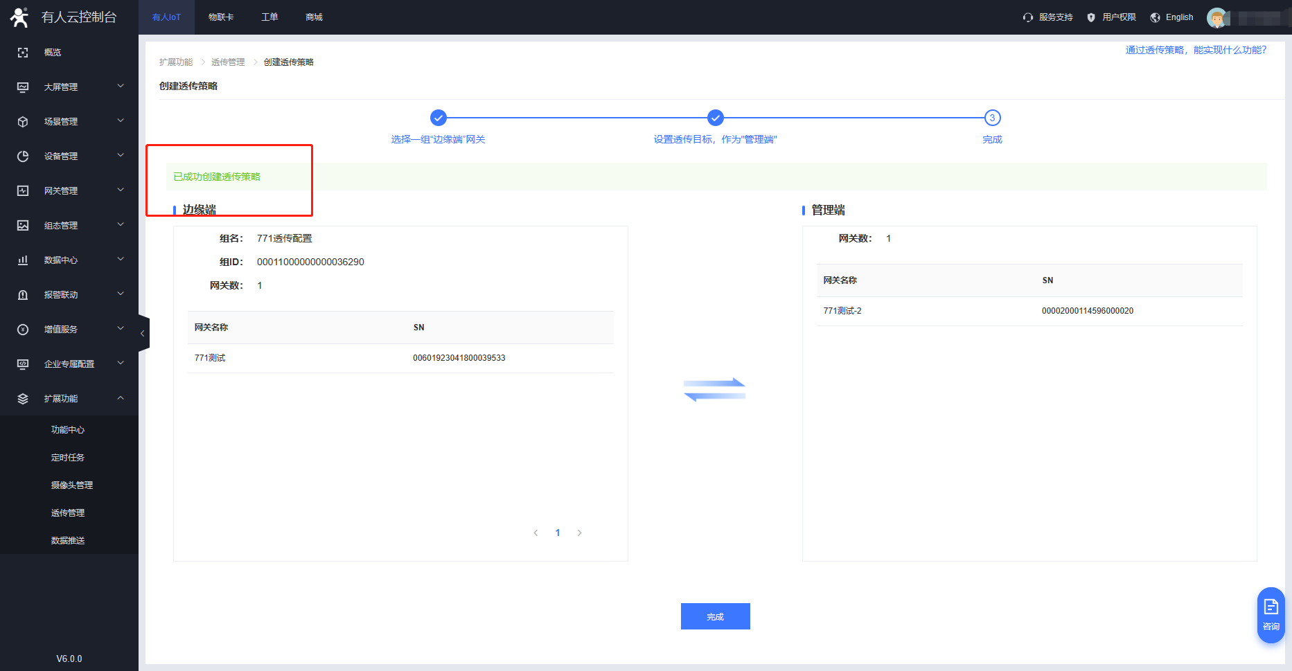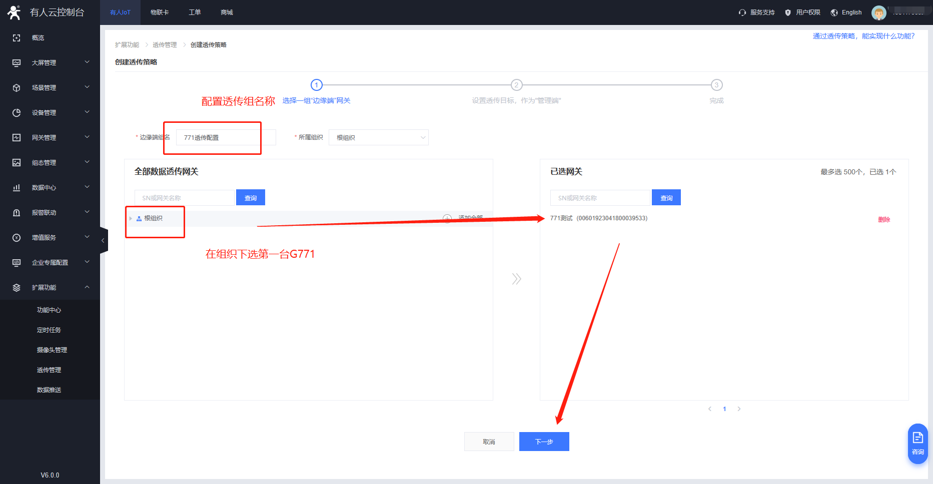 3、在云平臺擴(kuò)展功能開啟透傳管理的功能。在云端創(chuàng)建數(shù)據(jù)透傳組將兩臺G771進(jìn)行關(guān)聯(lián)。
