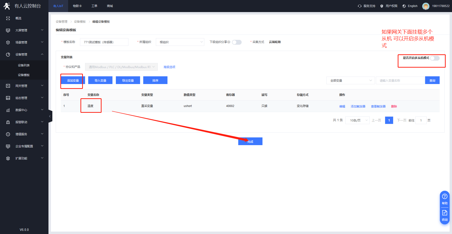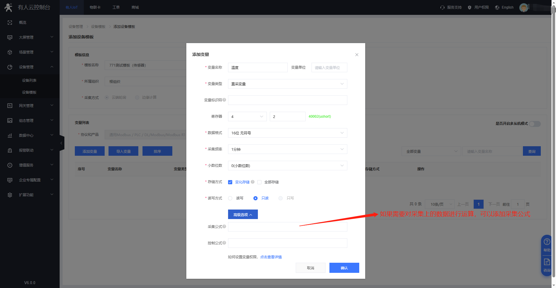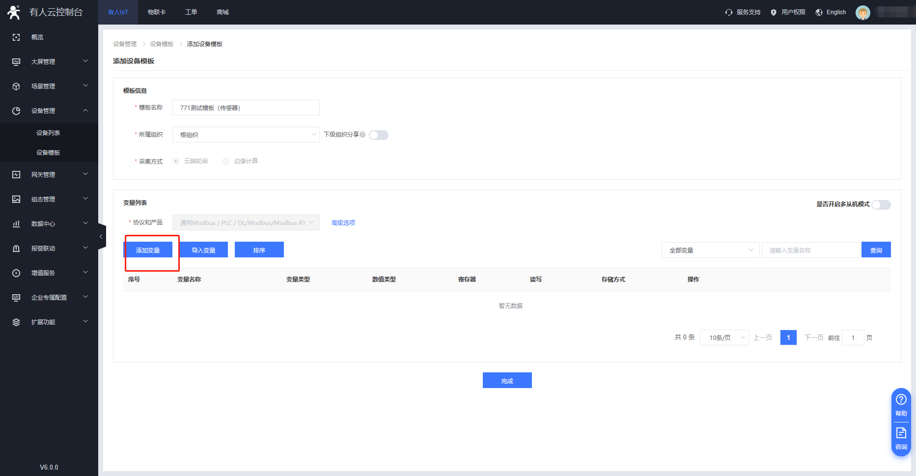 3、G771 支持modbus協(xié)議 云端輪詢方式。在設(shè)備管理---設(shè)備模板界面添加需要采集的變量點。寄存器信息需要與串口設(shè)備進行匹配。